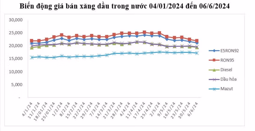 Từ 15h ngày 6/6/2024, liên Bộ Công Thương - Tài chính đã có quyết định điều chỉnh giá bán lẻ xăng dầu. Cụ thể: