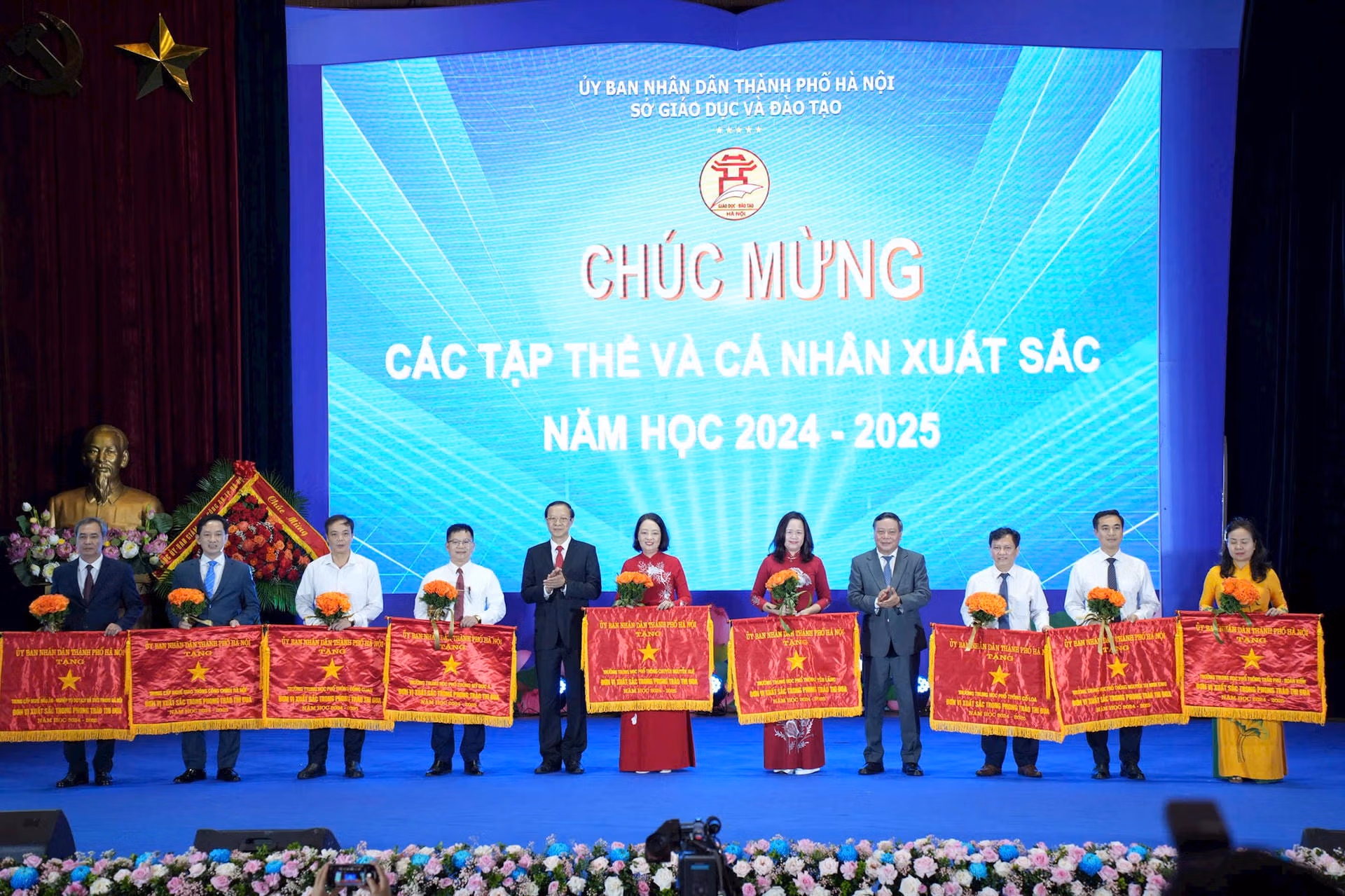 Tại hội nghị, Sở GDĐT Hà Nội đã tổ chức trao Cờ thi đua xuất sắc của UBND thành phố cho 9 trường học thuộc Sở; trao Bằng khen của UBND thành phố cho 6 học sinh đạt thành tích xuất sắc năm học 2024-2025.