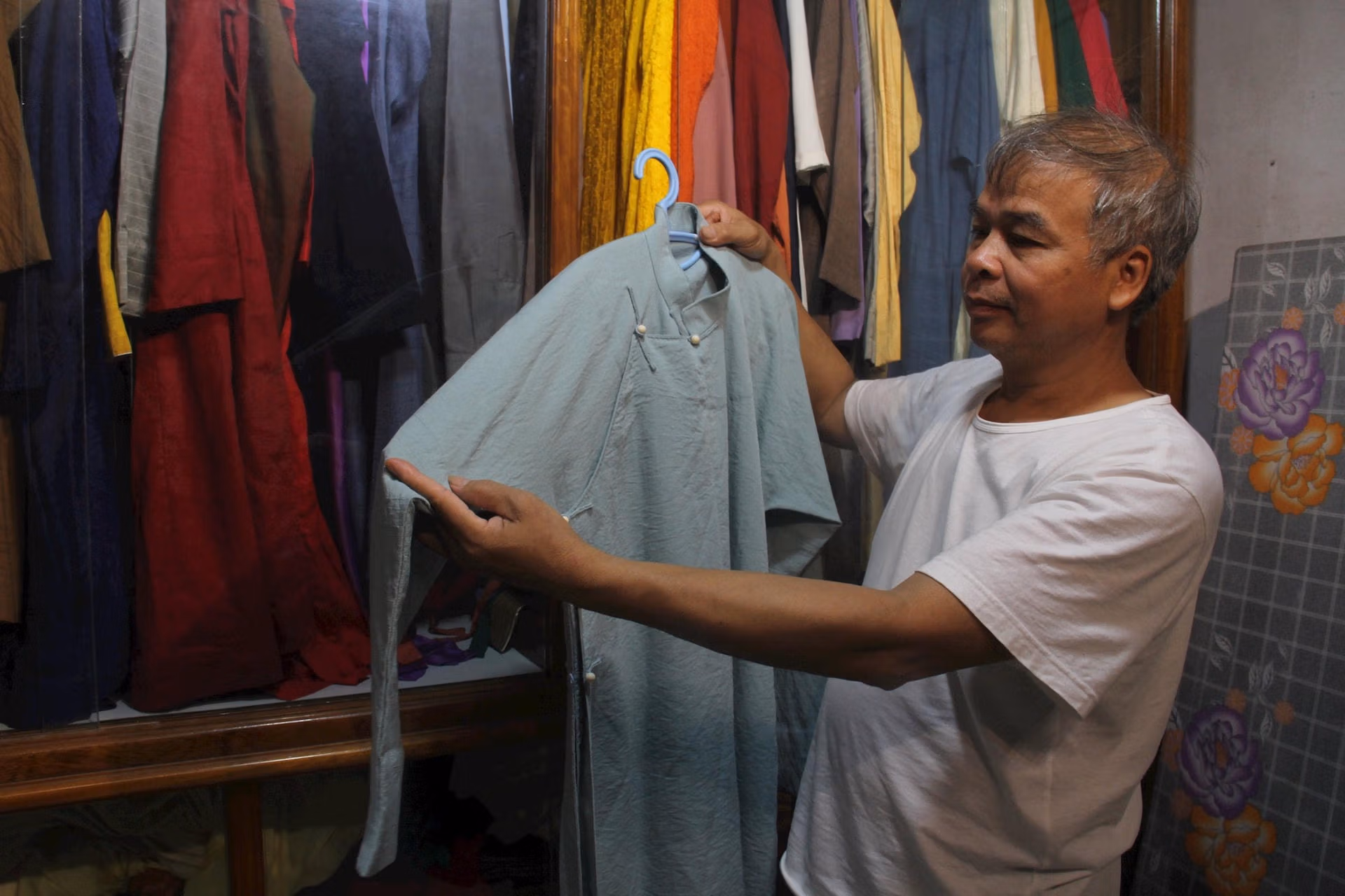 Theo chỉ dẫn của ông Mạnh, chúng tôi tìm đến nhà ông Đỗ Minh Tám. Ông Tám là người làm nghề may áo dài truyền thống có tiếng ở Trạch Xá.