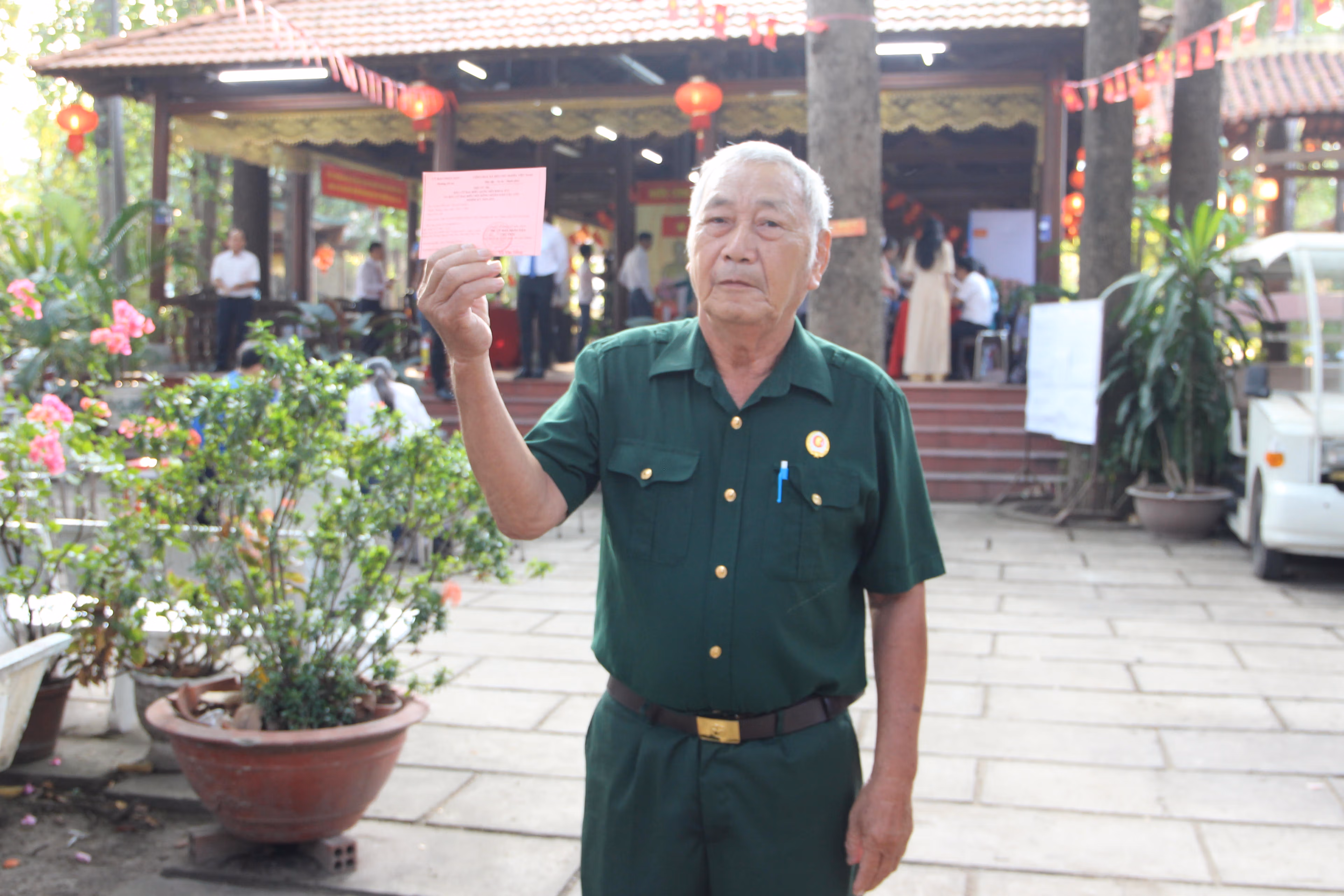 Cụ ông Phạm Quang Thìn, 75 tuổi, đến điểm bỏ phiếu từ rất sơm, cầm trên tay là phiếu, ông Thìn chia sẻ, tôi thấy thật tự hào và vinh dự khi trực tiếp bỏ phiếu, lựa chọn ra những người có phẩm chất ưu tú, đại diện cho tiếng nói của nhân dân. Tôi hy vọng những ứng cử viên trúng cử sẽ thể hiện được năng lực, trách nhiệm với nhân dân, quan tâm hơn nữa đến đời sống của người dân đến các cơ quan chức năng để công nhân có cuộc sống tốt hơn, đáp ứng được những nhu cầu tối thiểu của cuộc sống.