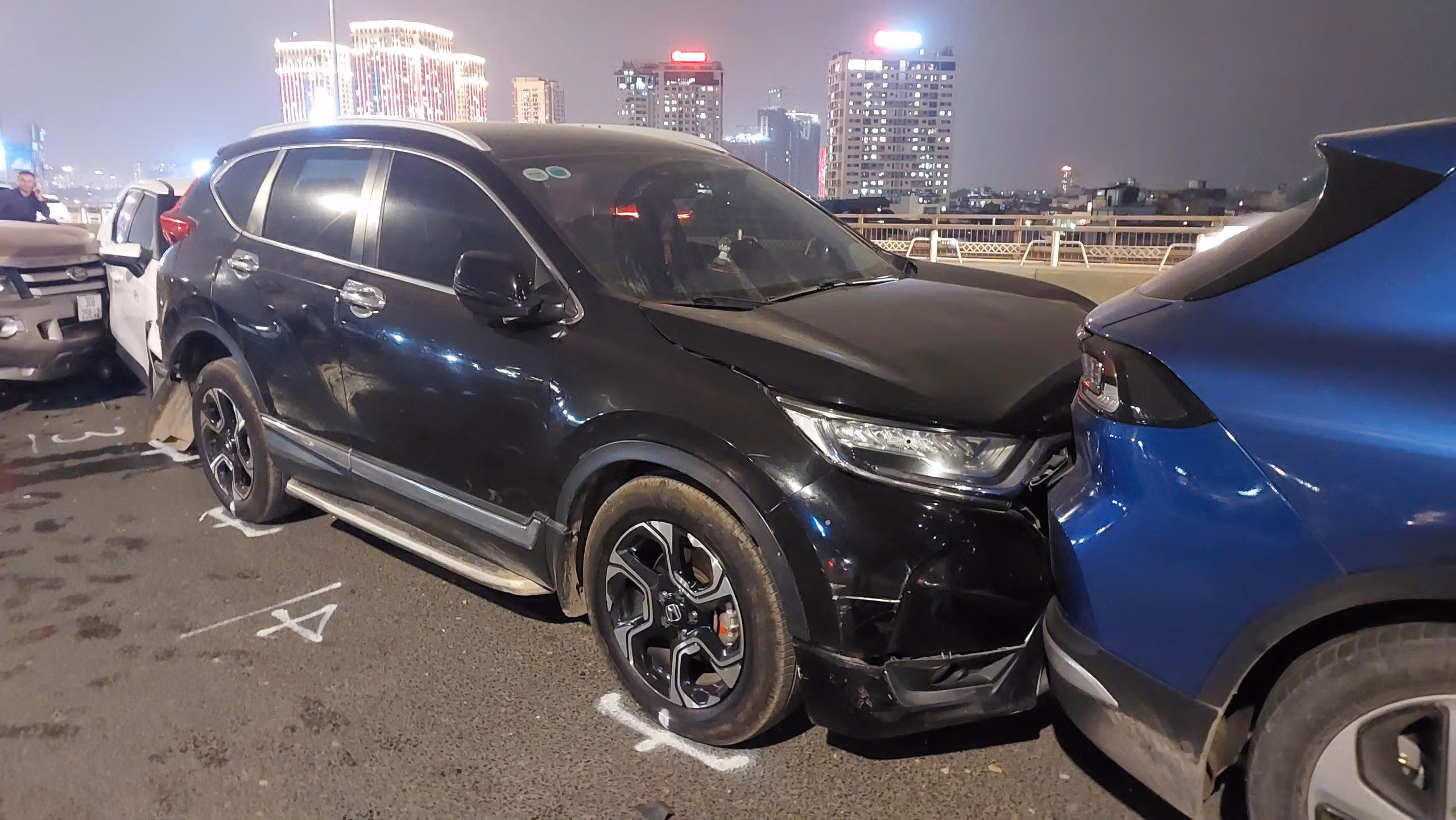 Tại hiện trường, 6 xe ô tô đâm dồn toa ở làn đường sát dải phân cách giữa của cầu Nhật Tân. Trong đó, xe ô tô mang BKS 98A-523.xx bị hư hỏng phần đầu; 5 xe khác bị móp méo, biến dạng.