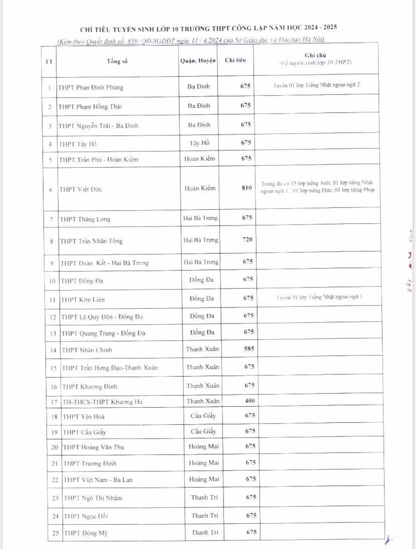 Theo quyết định của Sở GDĐT Hà Nội, Sở giao chỉ tiêu kế hoạch tuyển sinh lớp 10 năm học 2024-2025 cho 127 trường THPT công lập và công lập tự chủ tuyển mới 1.742 lớp và 77.250 học sinh.