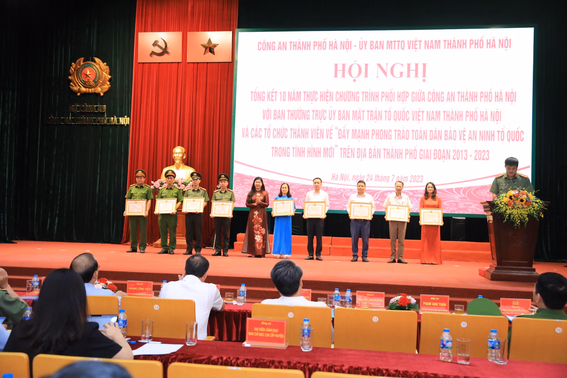 Dịp này, UBND thành phố Hà Nội trao tặng Bằng khen cho 10 tập thể, 9 cá nhân; Giám đốc Công an thành phố và Ủy ban MTTQ thành phố Hà Nội tặng Giấy khen cho nhiều tập thể và cá nhân có thành tích xuất sắc trong thực hiện Chương trình phối hợp số 09 về “Đẩy mạnh phong trào toàn dân bảo vệ an ninh Tổ quốc trong tình hình mới”, giai đoạn 2013-2023.