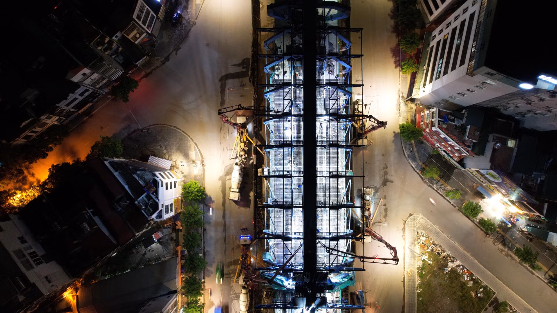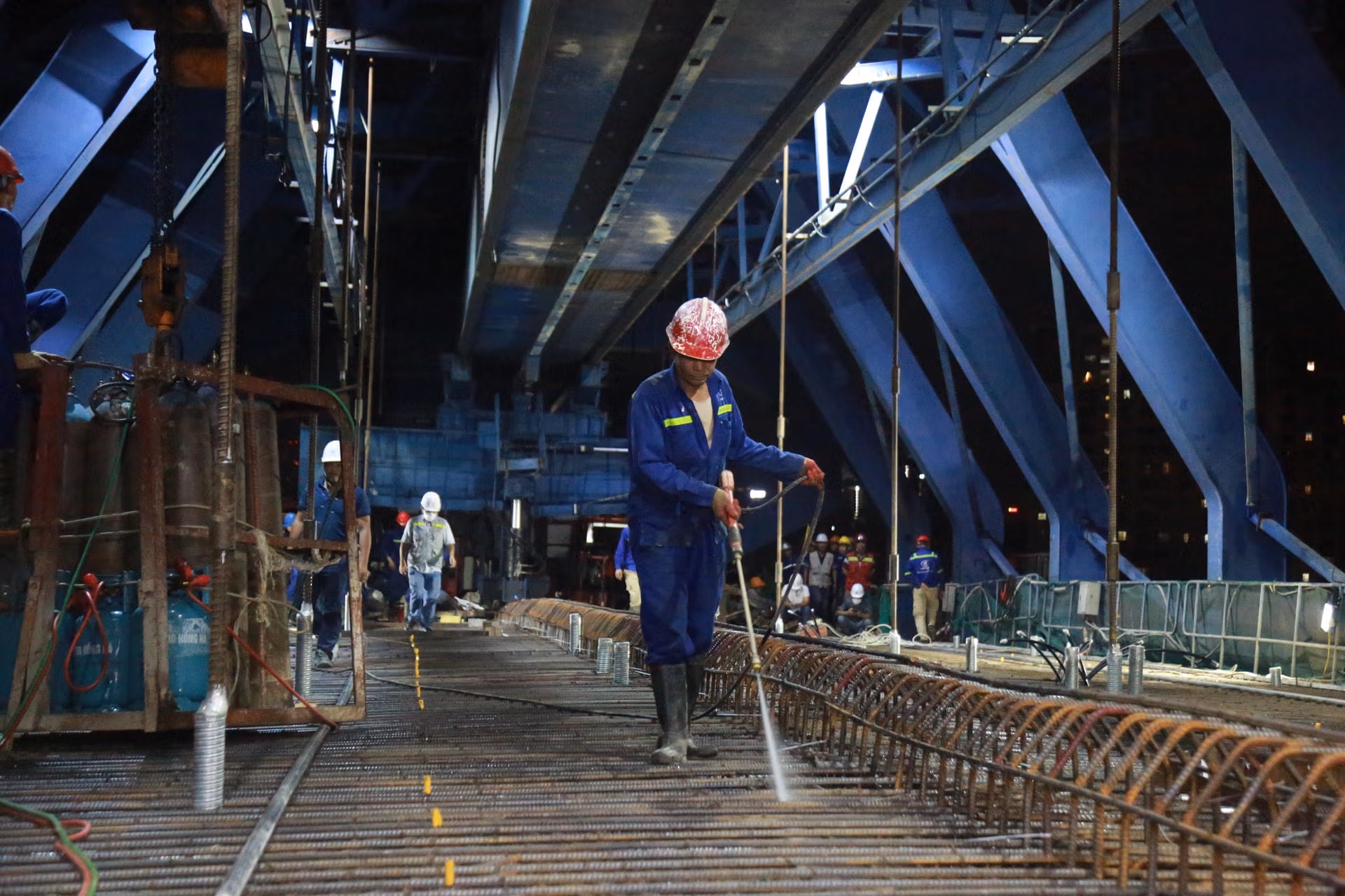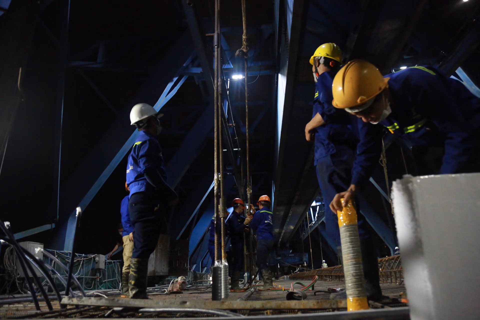 Đêm 14/7 trên công trường thi công dự án đường đai 2, hàng trăm công nhân đổ bê tông hợp long nhịp cầu cuối của dự án. Dự kiến đoạn trên cao từ cầu Vĩnh Tuy đến Ngã Tư Vọng sẽ thông xe vào cuối tháng 12/2022.