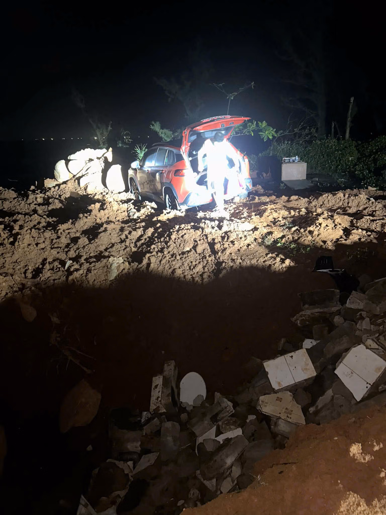 Theo ảnh tại hiện trường, chiếc xe ô tô hiệu Toyota Corolla Cross của anh L. hỏng hoàn toàn phần đầu khi tông thẳng vào những hòn đá thải lớn. Đặc biệt nguy hiểm hơn, nếu không có đá thải chắn chiếc ô tô đã lao xuống biển. Trên bãi thải là những hố đất được đào sâu nguy hiểm nhưng không được cảnh báo.