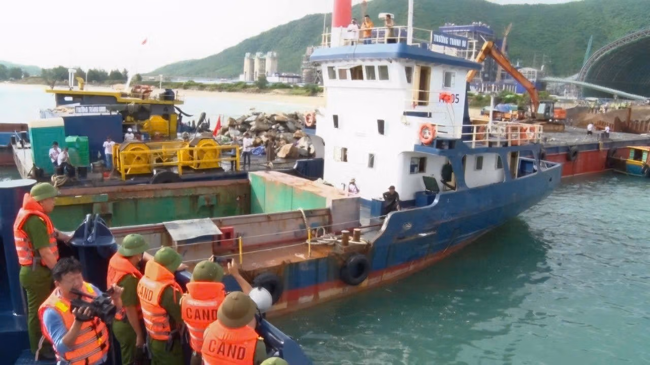 Phát hiện 1 xà lan, 3 tàu biển của Công ty TNHH Hoàng Nguyên - Vũng Tàu và các thuyền viên, công nhân trên các phương tiện neo đậu trái phép tại khu vực thi công dự án, tỉnh Hà Tĩnh và thị xã Kỳ Anh huy động lực lượng di dời.