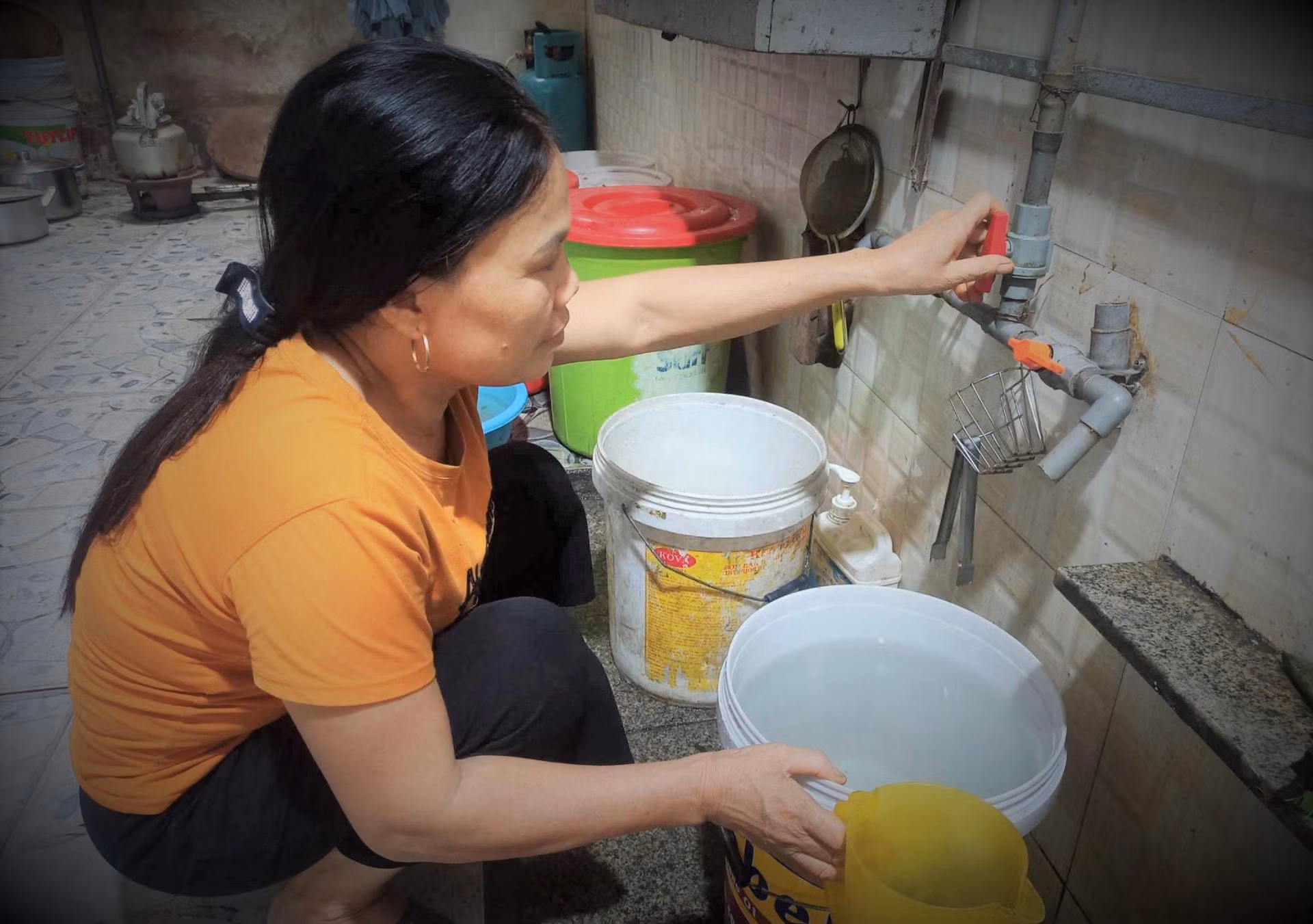 Khi xe bồn chở nước về từng cụm dân cư, người dân tranh thủ gom toàn bộ xô, chậu, vật dụng chứa nước để trữ dùng dân. Việc thiếu nước sinh hoạt những ngày qua đã làm đảo lộn cuộc sống của hàng nghìn người dân thị xã Hồng Lĩnh.
