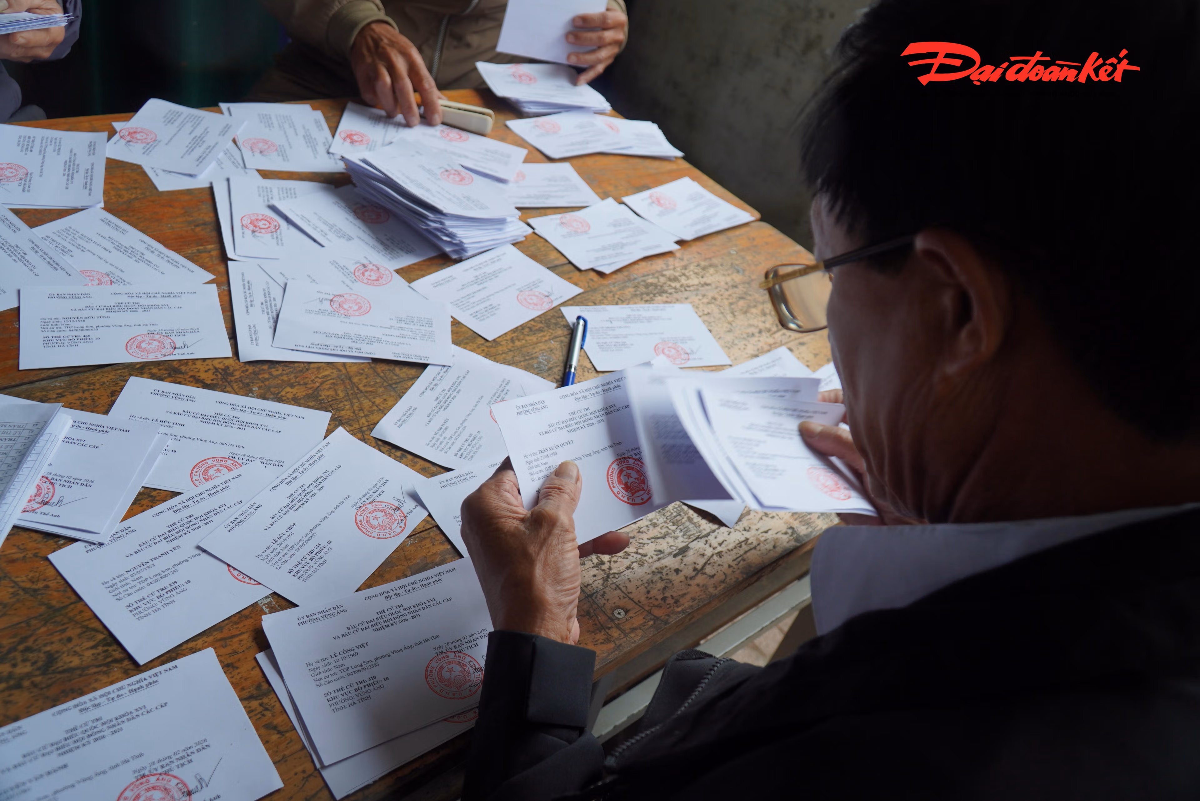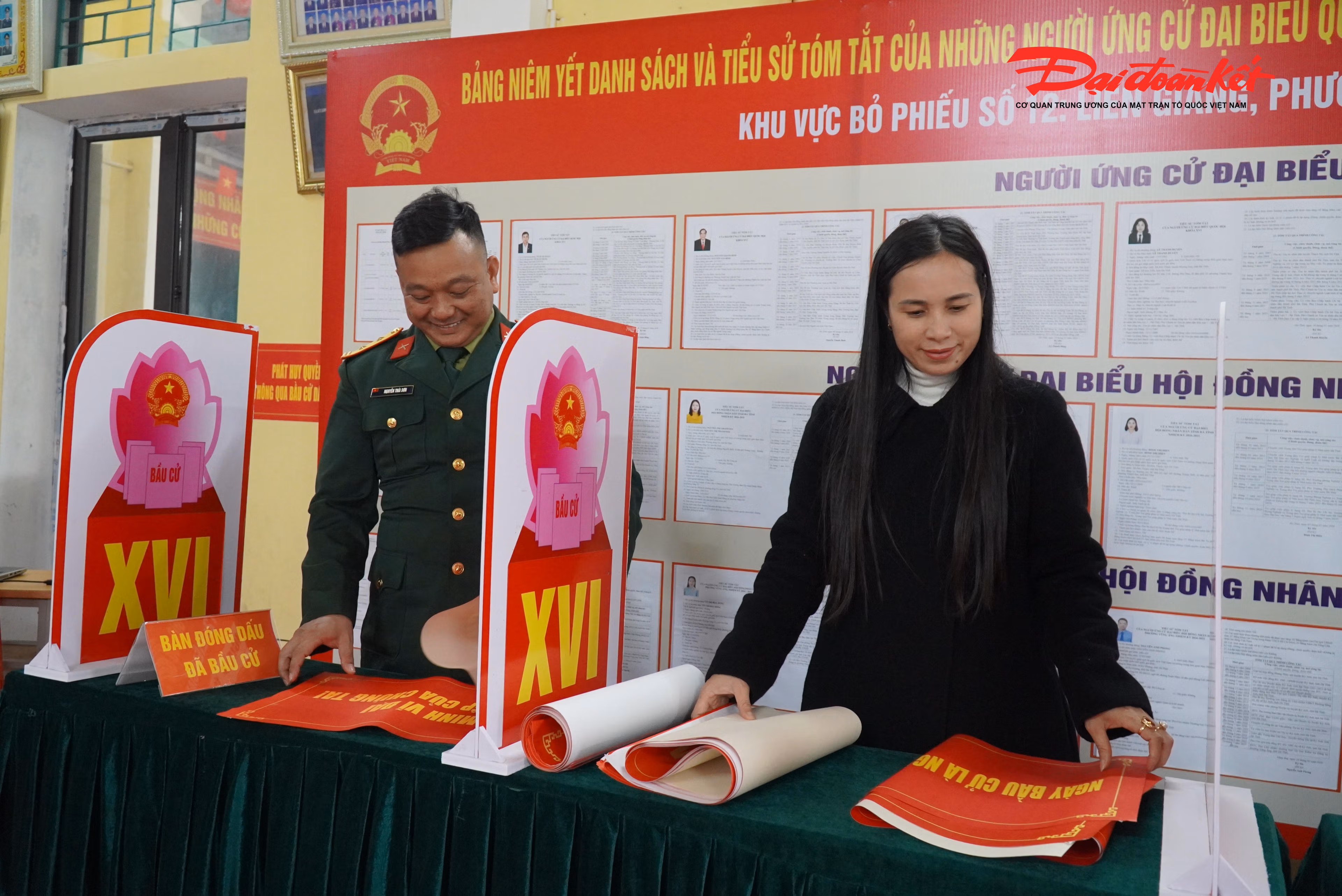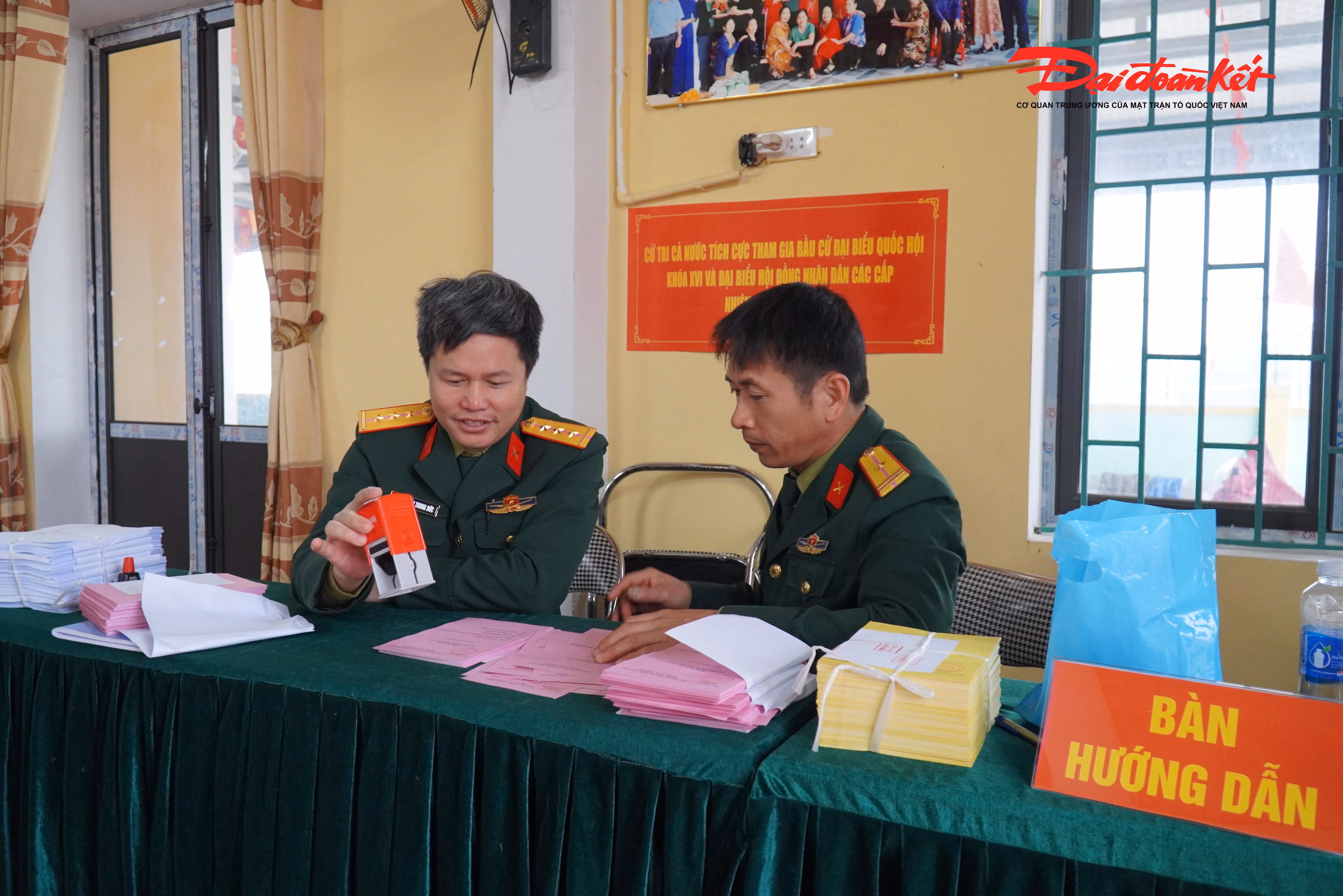 Ở một góc khác, hai cán bộ thuộc lực lượng quân sự cẩn thận đóng dấu lên từng lá phiếu bầu cử. Những con dấu đỏ lần lượt hiện lên, từng tập phiếu được xếp gọn gàng chờ chuyển sang khâu tiếp theo.