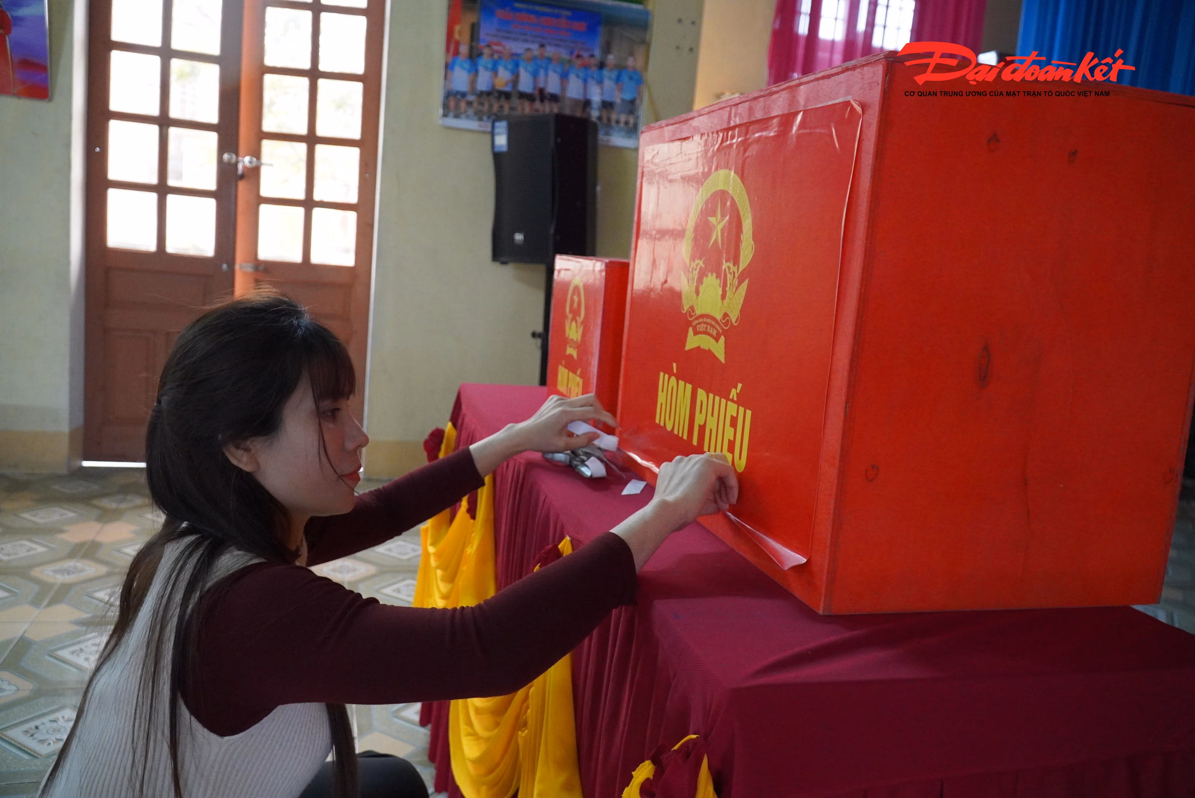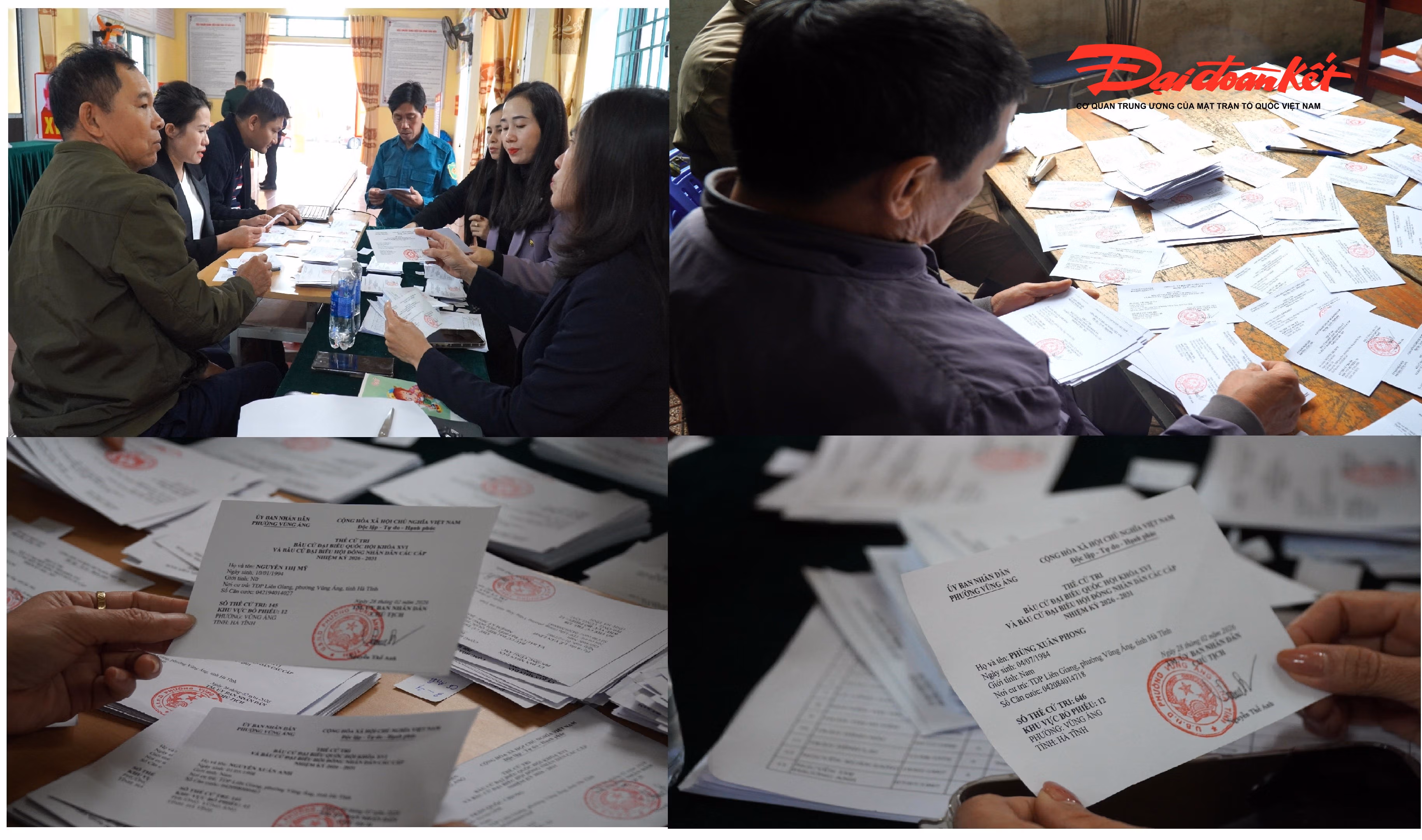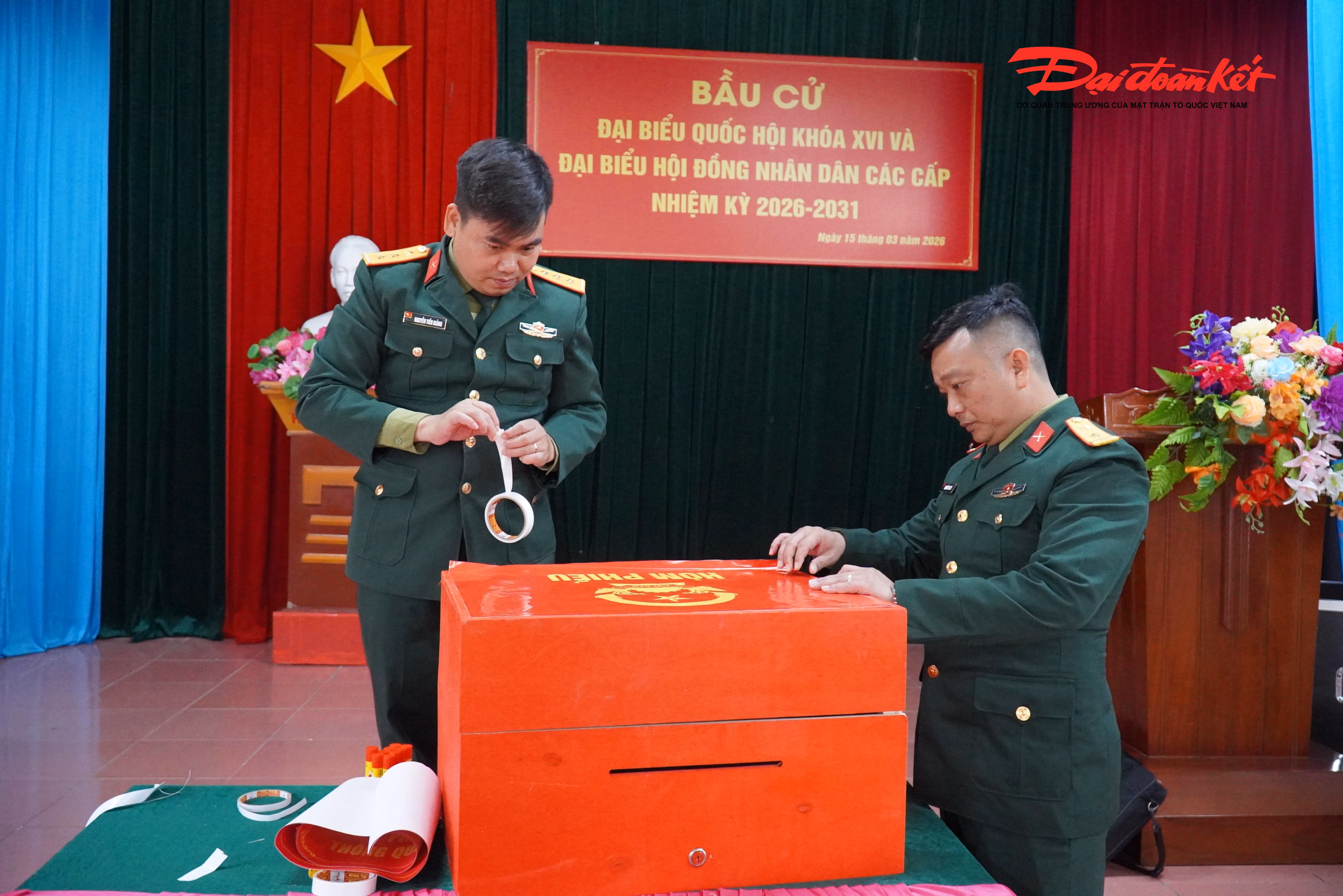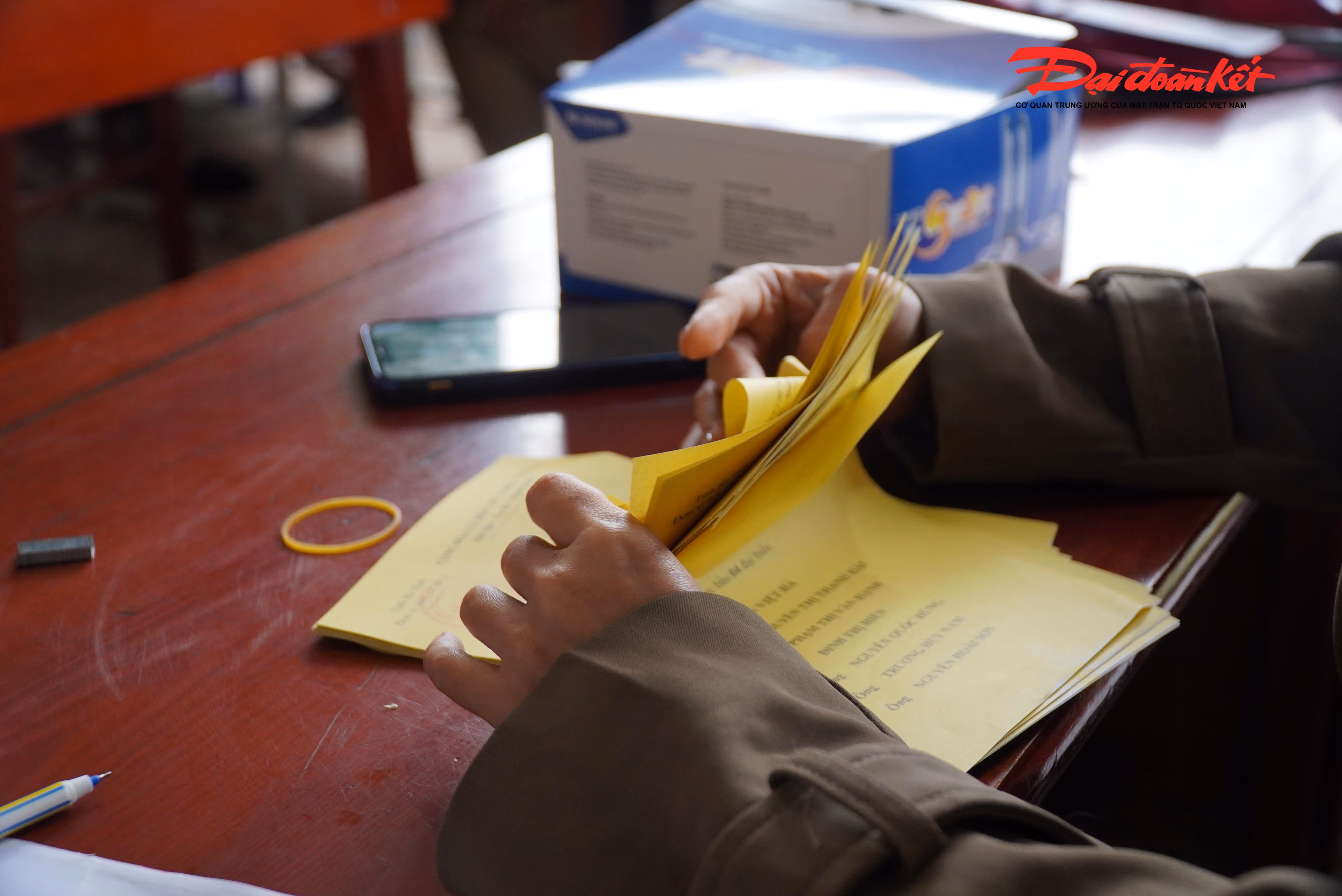 Ở một góc khác, hai cán bộ thuộc lực lượng quân sự cẩn thận đóng dấu lên từng lá phiếu bầu cử. Những con dấu đỏ lần lượt hiện lên, từng tập phiếu được xếp gọn gàng chờ chuyển sang khâu tiếp theo.