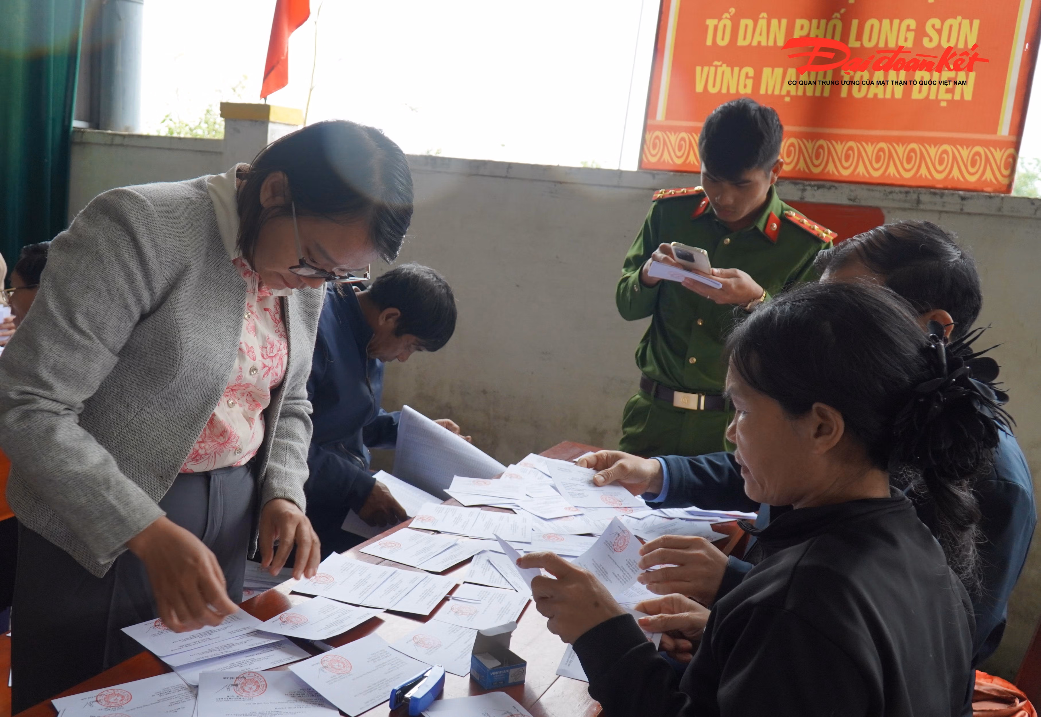 Không khí chuẩn bị cũng diễn ra khẩn trương tại nhà văn hóa tổ dân phố Long Sơn. Các bàn làm việc được kê sát nhau để thuận tiện xử lý hồ sơ và tài liệu. Cán bộ tổ dân phố cùng lực lượng công an, quân sự và cán bộ phường phối hợp rà soát lại danh sách cử tri, chuẩn bị bảng niêm yết và sắp xếp khu vực bỏ phiếu. Mỗi người đảm nhận một phần việc khác nhau nhưng đều hướng đến mục tiêu chung là đảm bảo công tác bầu cử diễn ra thuận lợi.