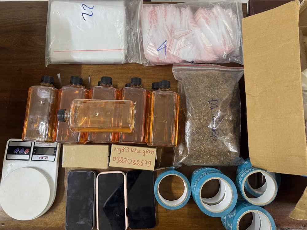 Khám xét khẩn cấp nơi ở, công an thu giữ khoảng 1 kg ma túy thành phẩm; 9 kg thảo mộc khô; 11 chai (5 lít) dung dịch dùng để tẩm ướp và nhiều tang vật liên quan.