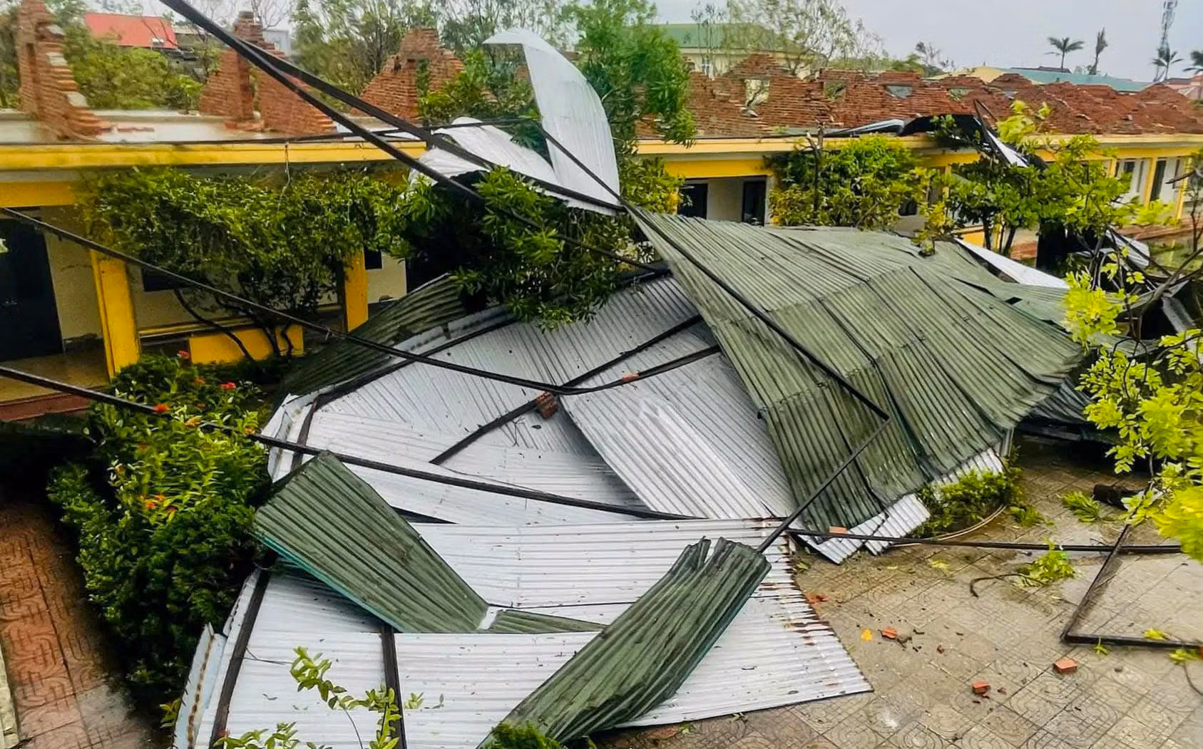 Chỉ sau một đêm bão số 10 đổ bộ, những ngôi trường vốn khang trang trở nên tiêu điều, xơ xác. Sân trường ngổn ngang cành cây gãy đổ, bảng biểu ngoài trời rách nát, nhiều phòng học, phòng chức năng tốc mái, cửa sổ vỡ tung. Ở một số nơi, nước ngập sâu khiến bàn ghế, thiết bị dạy học hư hỏng.