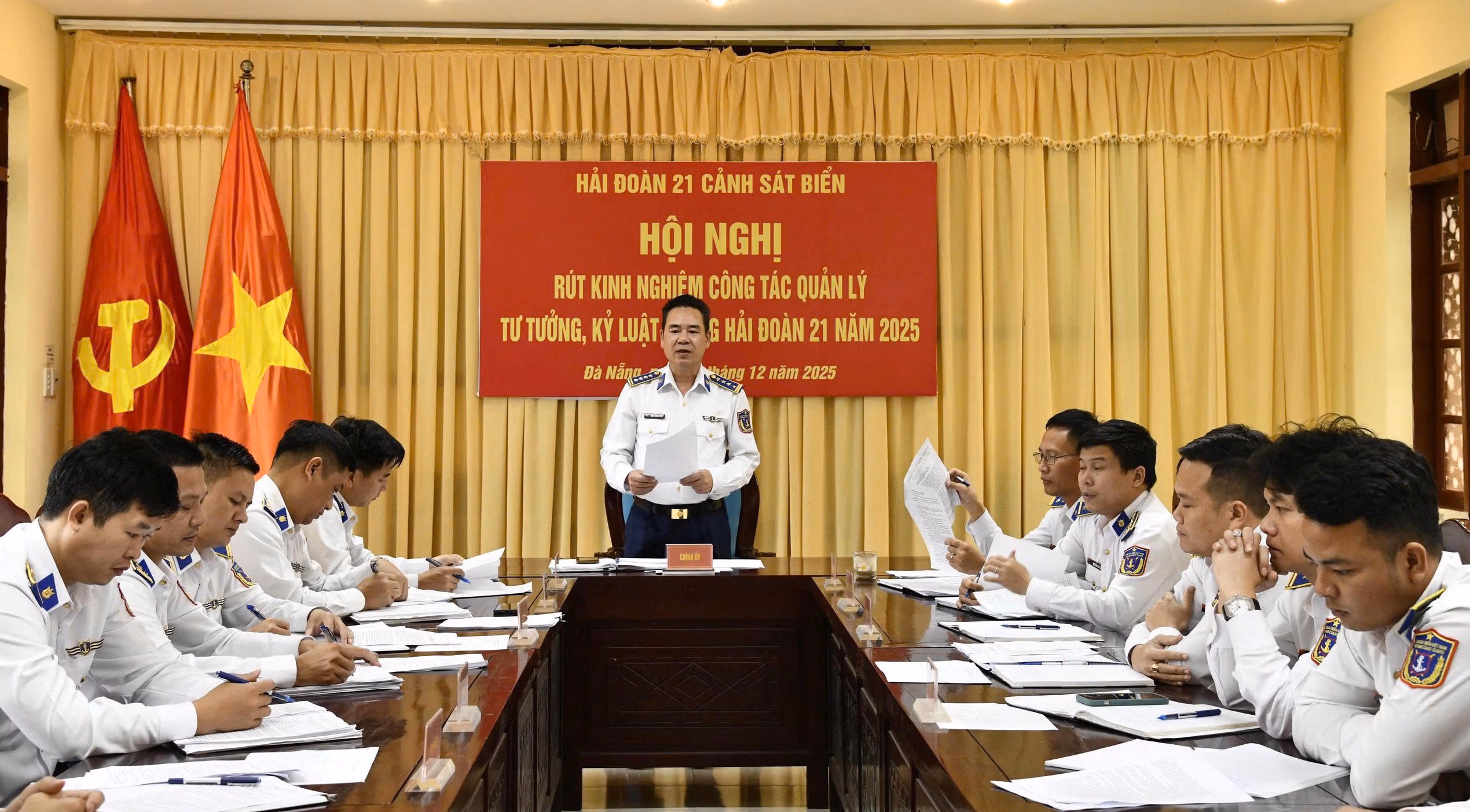 Chiều 26/12, Hải đoàn 21, Bộ Tư lệnh Vùng Cảnh sát biển 2 tổ chức Hội nghị rút kinh nghiệm công tác quản lý tư tưởng, kỷ luật năm 2025. Đại tá Triệu Quang Quy, Bí thư Đảng ủy, Chính ủy Hải đoàn 21 chủ trì hội nghị.