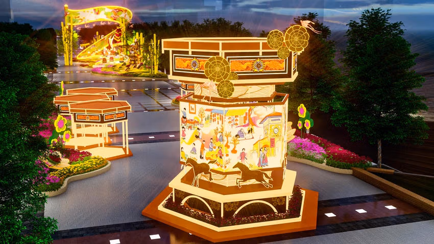 Cụm đại cảnh “Lý ngựa ô”, lấy cảm hứng từ làn điệu dân ca Nam Bộ, tái hiện nét văn hóa phương Nam bằng tạo hình vui nhộn, màu sắc xanh ngả tím hiện đại. Trong khi đó, khu vực “Rực rỡ miền ký ức” gây ấn tượng với chiếc đèn kéo quân khổng lồ cao hơn 6m, đường kính 6,4m. Trục xoay liên tục của đèn tái hiện những hình ảnh Tết dân gian, gợi nhắc ký ức truyền thống và bản sắc văn hóa Việt.