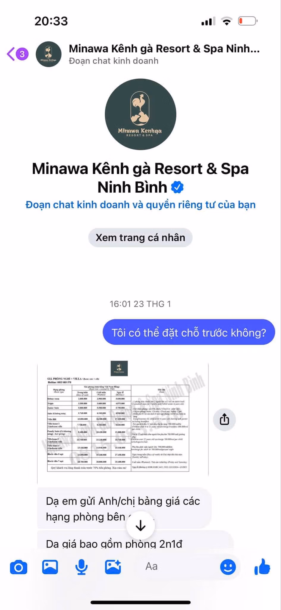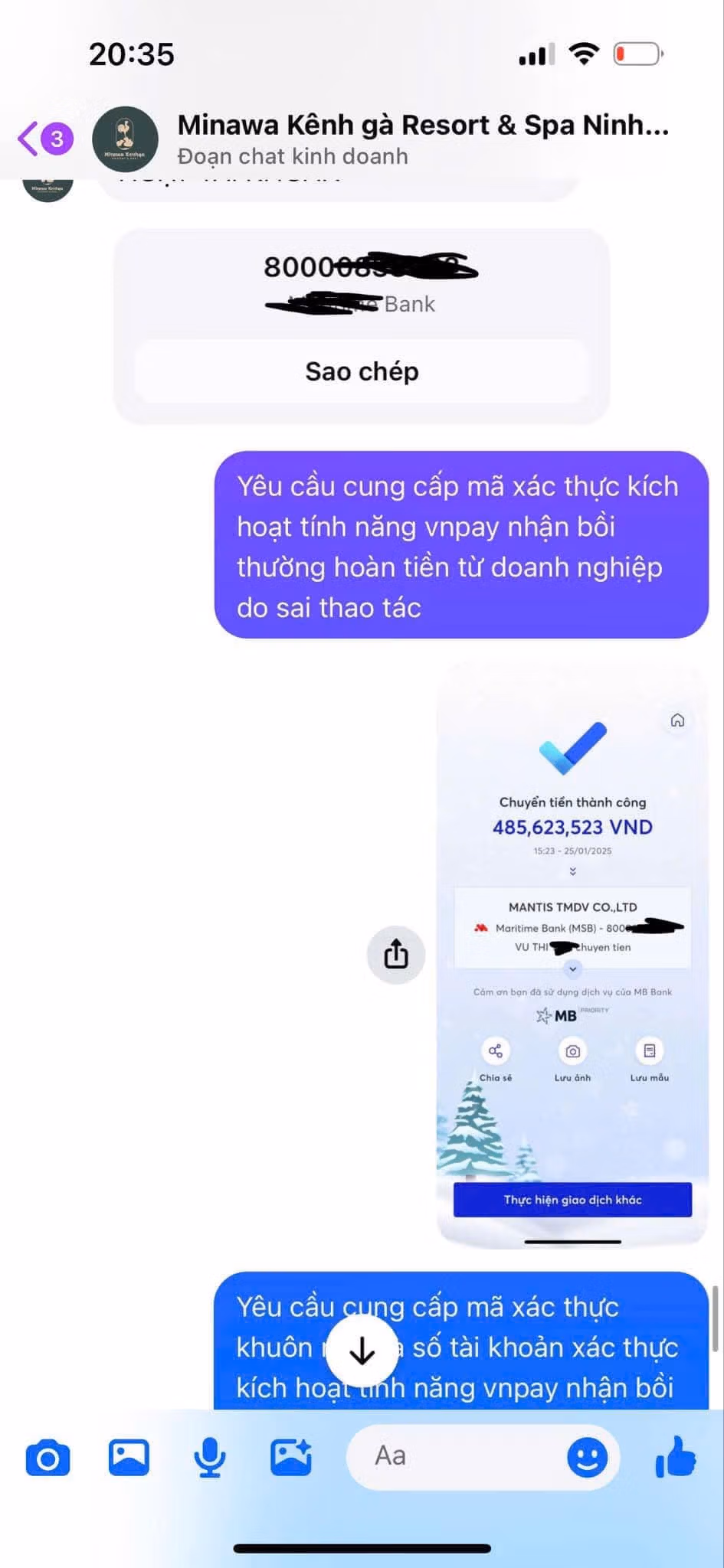 Theo chị P.T.T. (SN 1988, trú tại quận Hải An, Hải Phòng), gia đình chị có nhu cầu đi du lịch vào dịp Tết Nguyên đán do kỳ nghỉ dài ngày. Chị đã lên mạng tham khảo và đặt phòng qua Fanpage mang tên “Minawa Kênh gà Resort & Spa Ninh Bình”. Chị T. trao đổi, trò chuyện với nhân viên của trang web và được hướng dẫn, tư vấn nhiệt tình. Quá trình này, chị đã chuyển khoản 6,5 triệu đồng qua số tài khoản ngân hàng mà nhân viên tư vấn gửi để đặt cọc 2 phòng trong dịp nghỉ lễ. Tuy nhiên, nhân viên đó thông báo lại chị T. đã viết sai nội dung chuyển khoản.