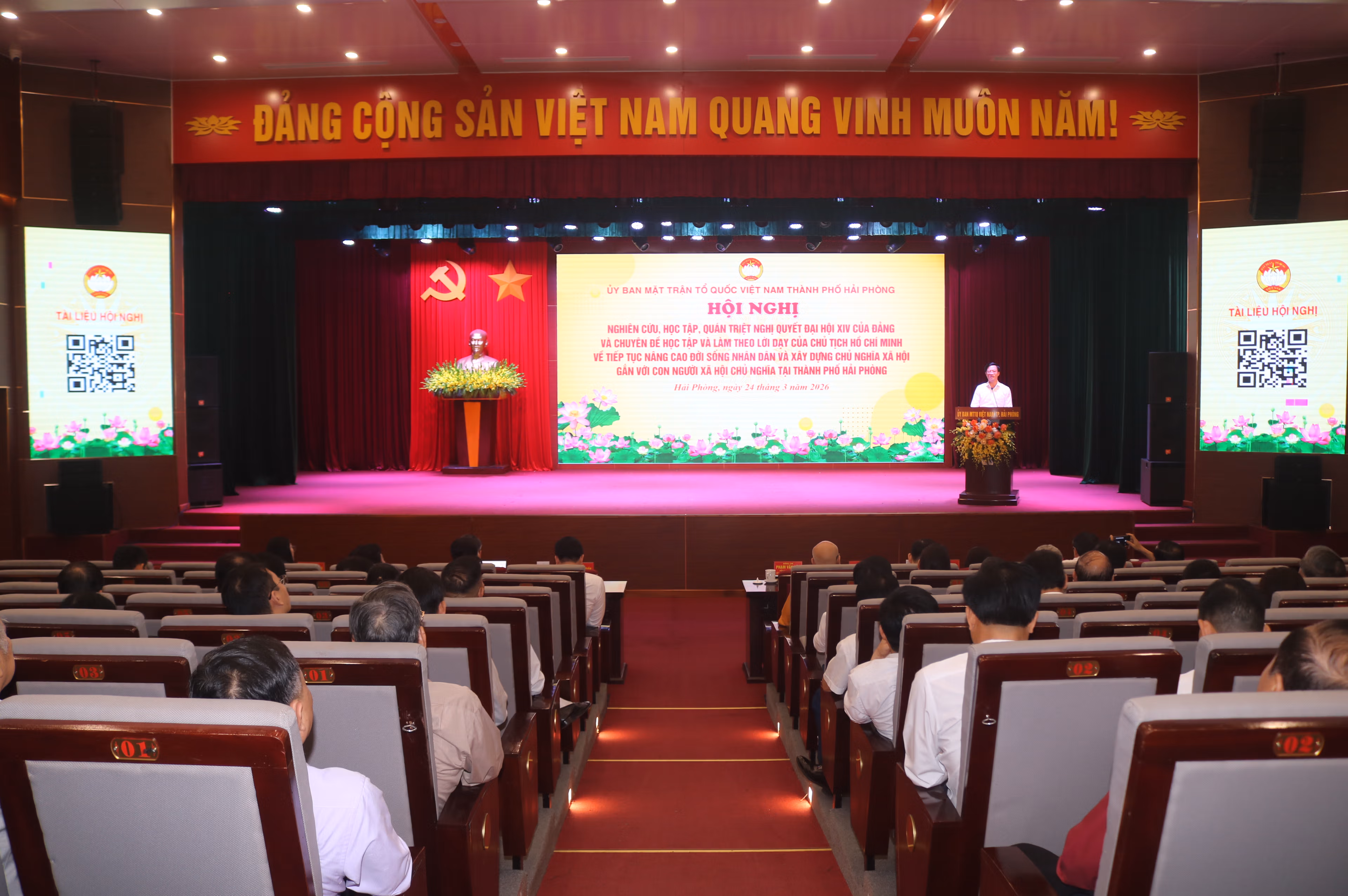 Sáng 24/3, Ủy ban MTTQ Việt Nam TP Hải Phòng tổ chức hội nghị nghiên cứu, học tập, quán triệt Nghị quyết Đại hội XIV của Đảng và chuyên đề năm 2026 về học tập, làm theo tư tưởng, đạo đức, phong cách Hồ Chí Minh.