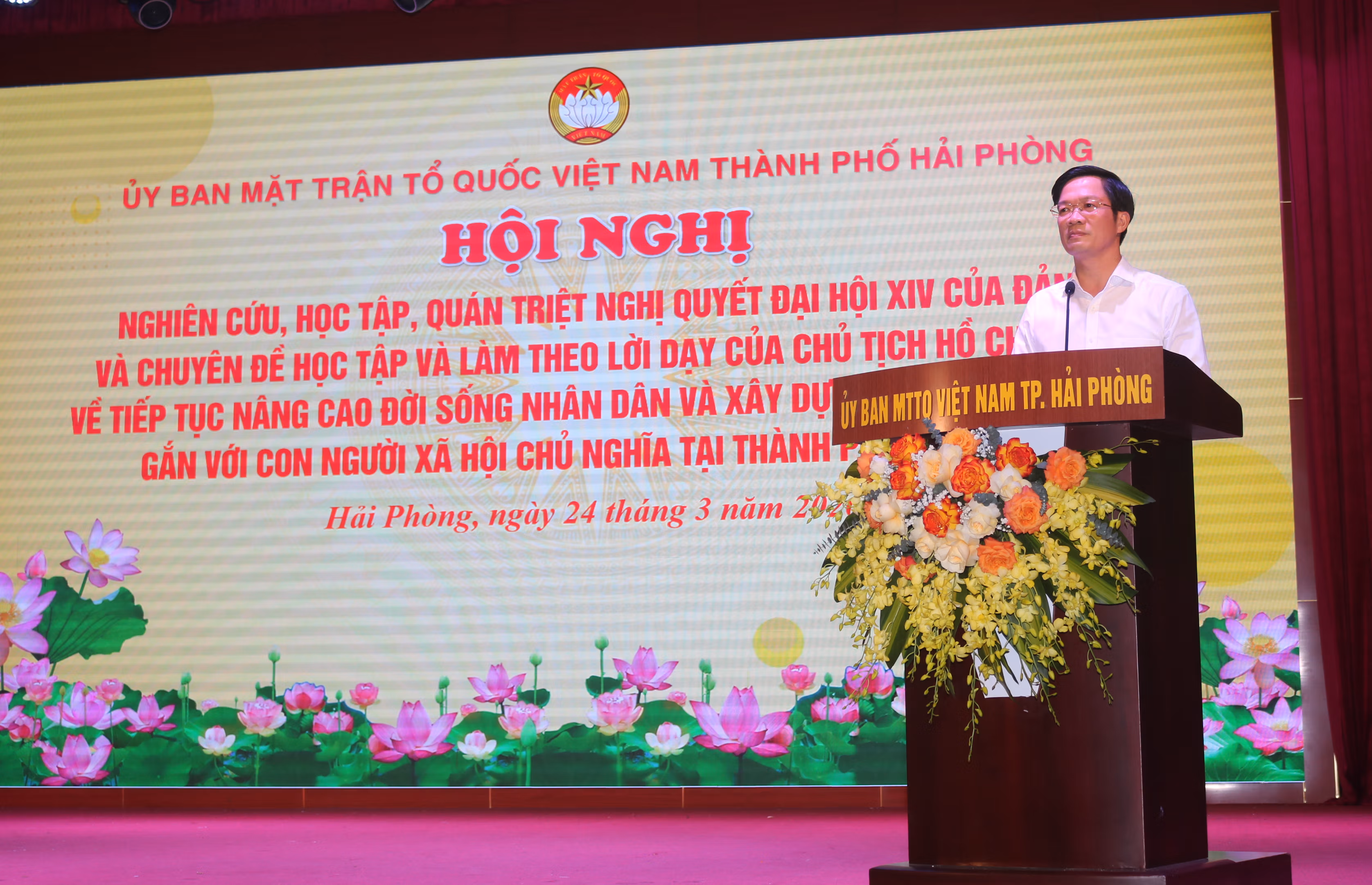 Phát biểu tại hội nghị, ông Phạm Văn Lập, Phó Bí thư Thành ủy, Chủ tịch Ủy ban MTTQ Việt Nam TP Hải Phòng nhấn mạnh: Nghị quyết Đại hội XIV của Đảng là sự kết tinh sâu sắc giữa lý luận và thực tiễn, thể hiện ý chí, khát vọng phát triển đất nước phồn vinh, hạnh phúc. Đối với Hải Phòng, việc tiên phong nghiên cứu, xây dựng mô hình chủ nghĩa xã hội (CNXH) gắn với con người xã hội chủ nghĩa (XHCN) mang ý nghĩa đặc biệt quan trọng, tạo nền tảng cho sự phát triển nhanh và bền vững trong giai đoạn mới.