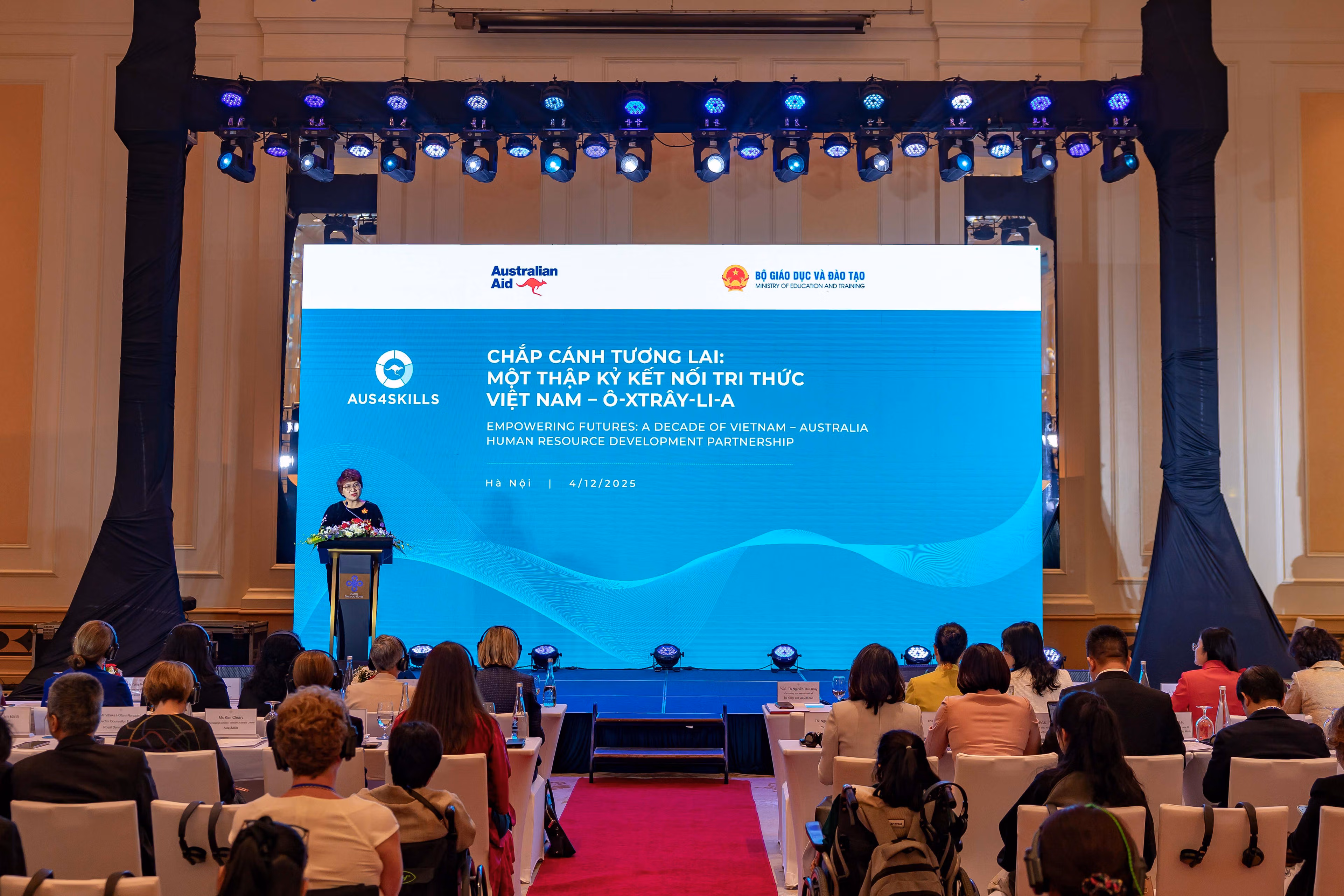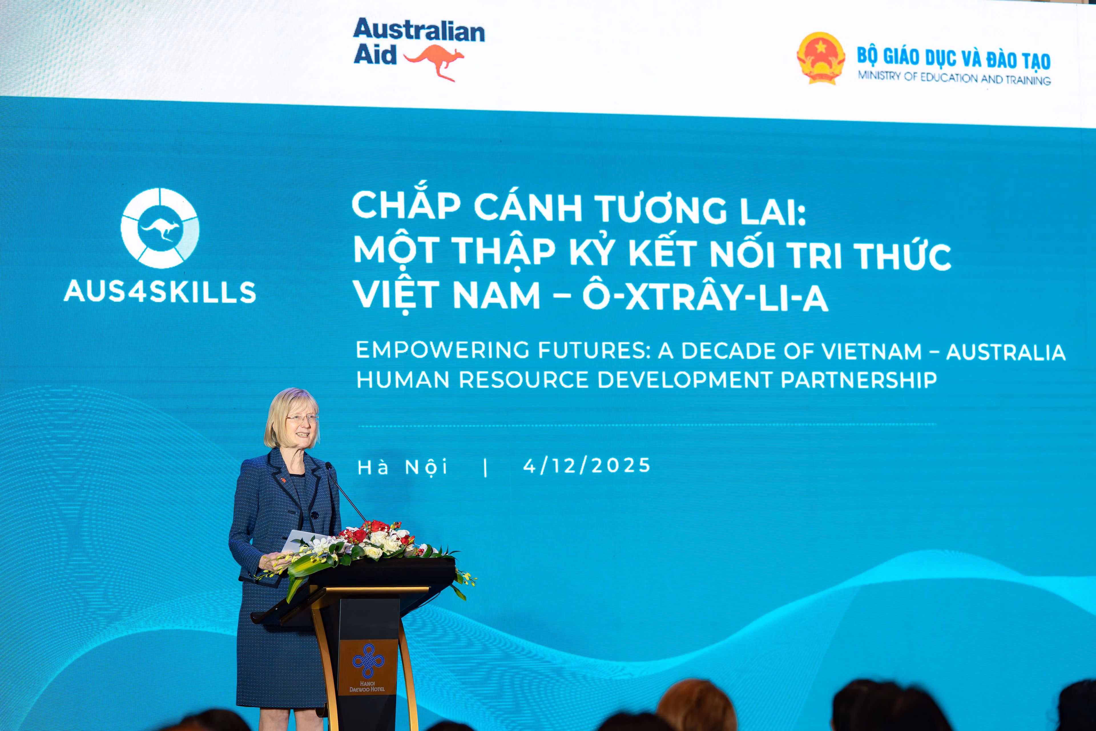 “Aus4Skills không chỉ là một chương trình mà còn là một cây cầu kết nối con người, ý tưởng và cơ hội giữa 2 quốc gia. Cùng nhau, chúng ta đã nâng tầm nguồn nhân lực của Việt Nam trong các lĩnh vực then chốt, trao quyền cho hàng nghìn cá nhân thông qua giáo dục và đào tạo, đồng thời thúc đẩy năng lực lãnh đạo, tạo động lực cho đổi mới và tăng trưởng toàn diện”, bà Gillian Bird, Đại sứ Australia tại Việt Nam khẳng định trong bài phát biểu tại Hội thảo.