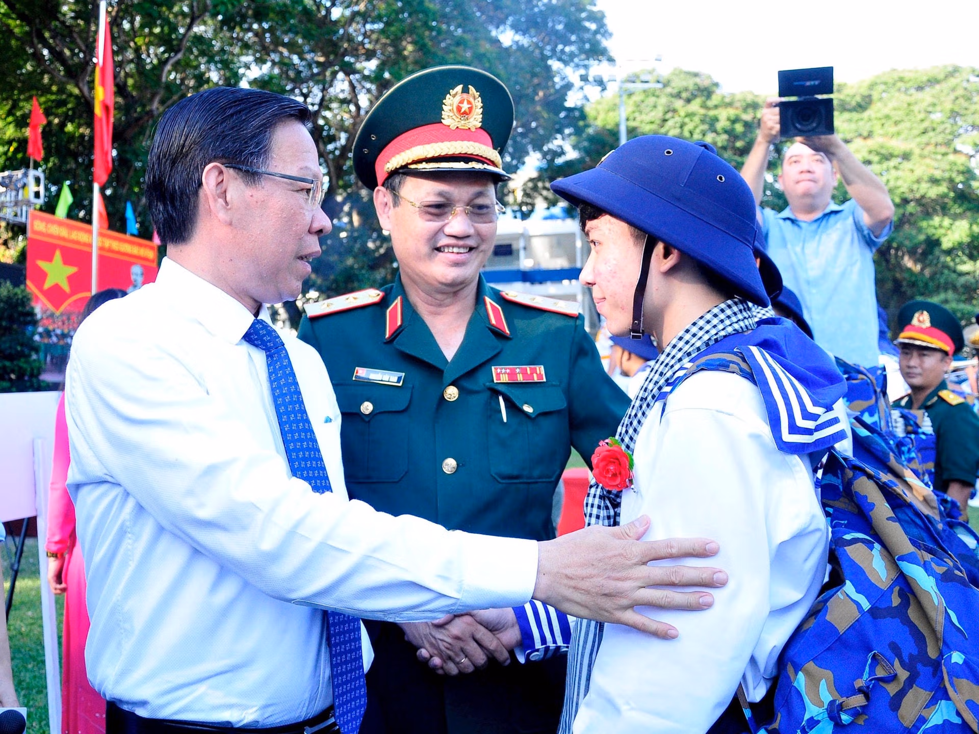 Tại lễ giao nhận quân, Chủ tịch UBND TP HCM đã đeo khăn rằn, bắt tay động viên các thanh niên nhập ngũ. Cũng tại đây, ông Phan Văn Mãi đã gửi gắm, bày tỏ mong các thanh niên sẽ phấn đấu, rèn luyện tốt, nếu có điều kiện phục vụ lâu dài trong quân đội.