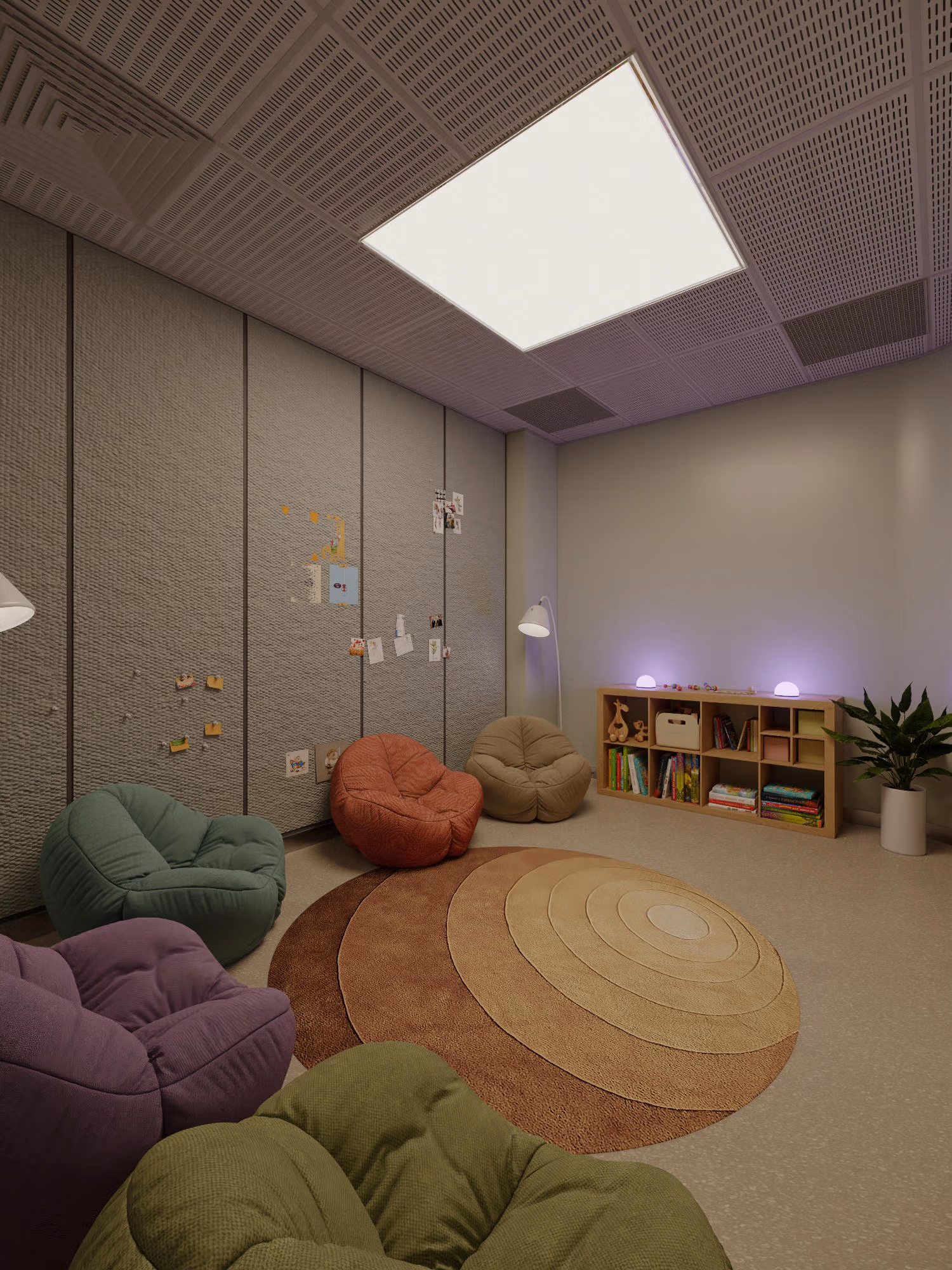 Các phòng can thiệp 1:1 và nhóm nhỏ được bố trí riêng tư, tối giản về thị giác nhằm giúp học sinh cảm thấy an toàn và tập trung vào quá trình trị liệu.