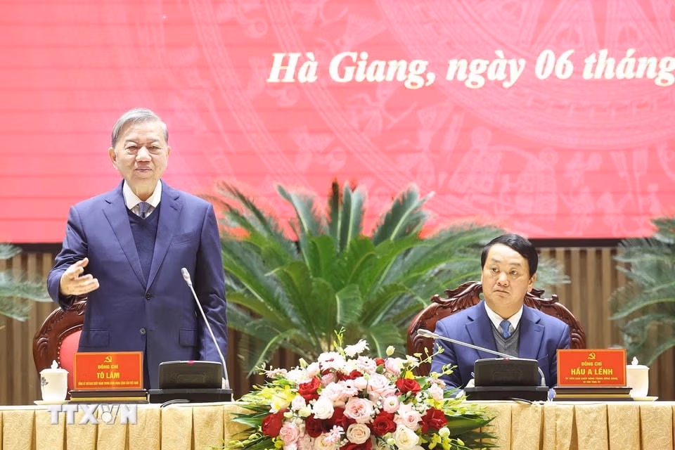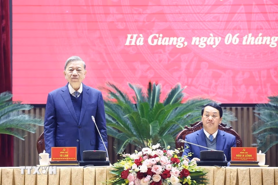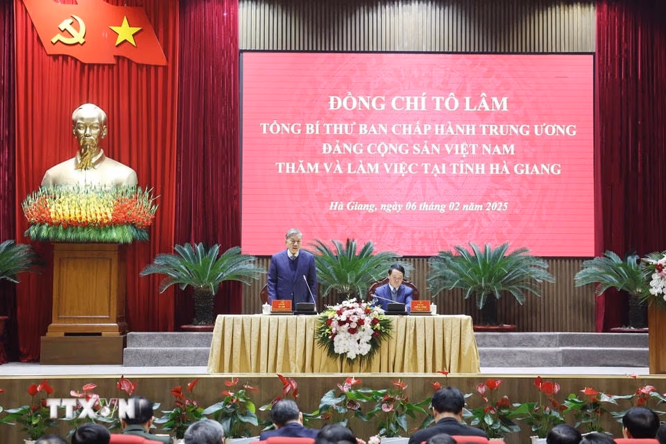 Hoạt động của Tổng Bí thư Tô Lâm tại Hà Giang Thứ Năm 06/02/2025 11:16 (GMT+7) Sáng 6/2/2025, Tổng Bí thư Tô Lâm và đoàn công tác Trung ương dâng hoa tưởng nhớ Chủ tịch Hồ Chí Minh tại Tỉnh ủy Hà Giang, thăm và làm việc với Ban Chấp hành Đảng bộ tỉnh Hà Giang. Tổng Bí thư Tô Lâm dâng hoa trước Tượng đài Bác Hồ trong khuôn viên Tỉnh ủy Hà Giang. (Ảnh: Thống Nhất/TTXVN)Tổng Bí thư Tô Lâm và đoàn công tác dâng hoa tưởng nhớ Chủ tịch Hồ Chí Minh tại Tỉnh ủy Hà Giang. (Ảnh: Thống Nhất/TTXVN)Tổng Bí thư Tô Lâm và đoàn công tác thành kính tưởng nhớ Chủ tịch Hồ Chí Minh. (Ảnh: Thống Nhất/TTXVN)Tiếp tục chương trình công tác tại Hà Giang, sáng 6/2/2025, tại Hà Giang, Tổng Bí thư Tô Lâm cùng Đoàn công tác Trung ương thăm và làm việc với Ban Chấp hành Đảng bộ tỉnh Hà Giang về kết quả thực hiện Nghị quyết Đại hội XIII của Đảng, Nghị quyết Đại hội Đảng bộ tỉnh lần thứ XVII, phương hướng, nhiệm vụ trọng tâm năm 2025. (Ảnh: Thống Nhất/TTXVN)Tổng Bí thư Tô Lâm phát biểu. (Ảnh: Thống Nhất/TTXVN)Tổng Bí thư Tô Lâm cùng Đoàn công tác Trung ương làm việc với Ban Chấp hành Đảng bộ tỉnh Hà Giang. (Ảnh: Thống Nhất/TTXVN)Tổng Bí thư Tô Lâm phát biểu. (Ảnh: Thống Nhất/TTXVN) Theo Vietnamplus