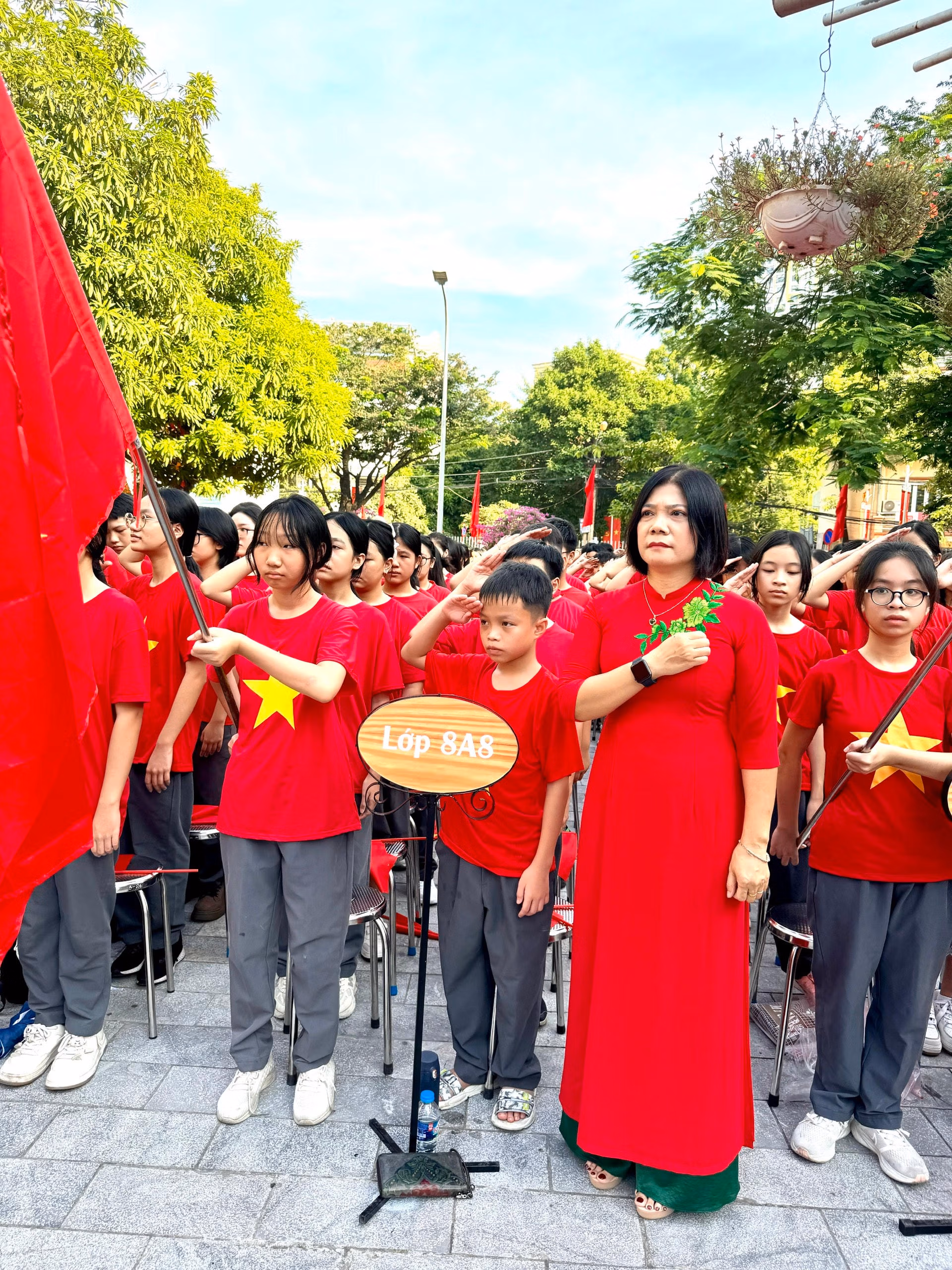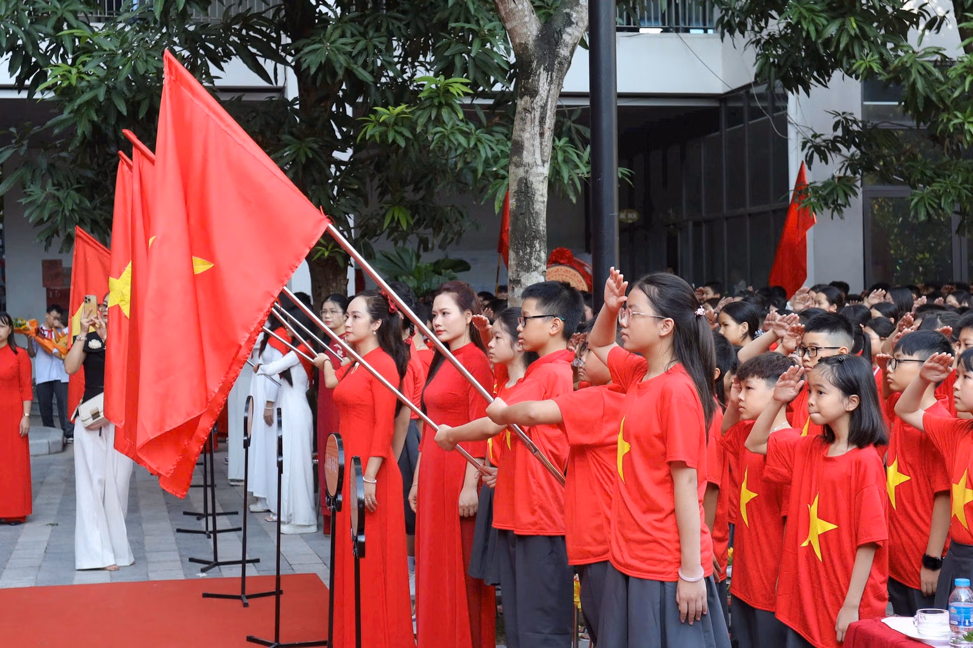 Điểm đáng chú ý tại Trường THCS Kim Giang trong lễ khai giảng năm nay là tất cả các em học sinh đều mặc đồng phục với áo cờ đỏ, sao vàng nhằm hòa chung trong không khí lễ kỷ niệm 80 năm Quốc khánh 2/9 và 80 năm Ngày thành lập ngành Giáo dục.