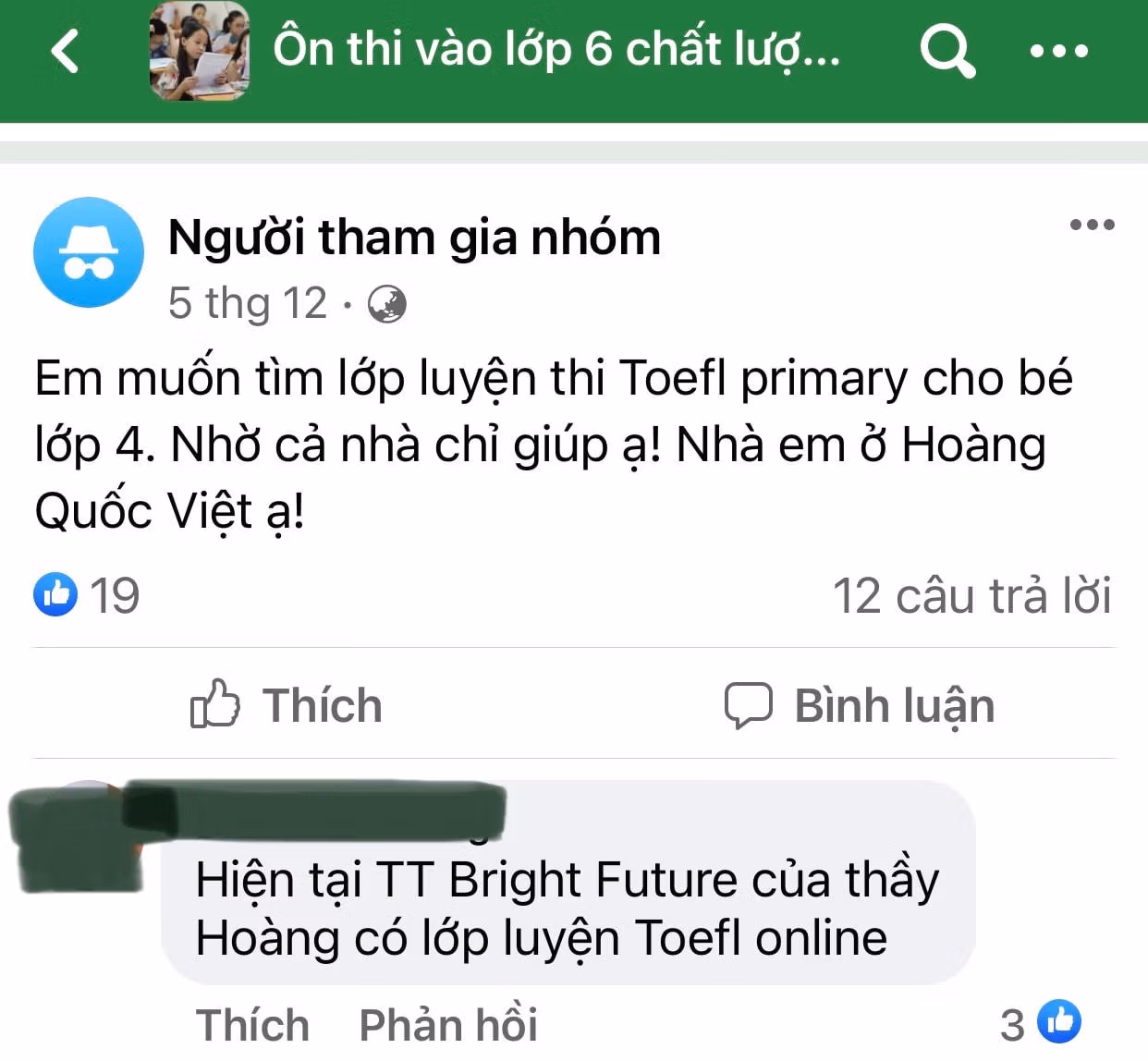 “Em muốn tìm lớp luyện thi TOEFL Primary cho bé lớp 4”, “Mọi người cho em hỏi về chứng chỉ tiếng Anh Starters, Movers, Flyers có bắt buộc với các bé cấp 1 không?”, “Giới thiệu giúp tôi lớp luyện thi TOEFL Primary online cho bé”,… Không khó tìm kiếm nhưng nội dung như thế này trên một group dành cho phụ huynh có con chuẩn bị thi vào lớp 6 chất lượng cao trên mạng xã hội Facebook.