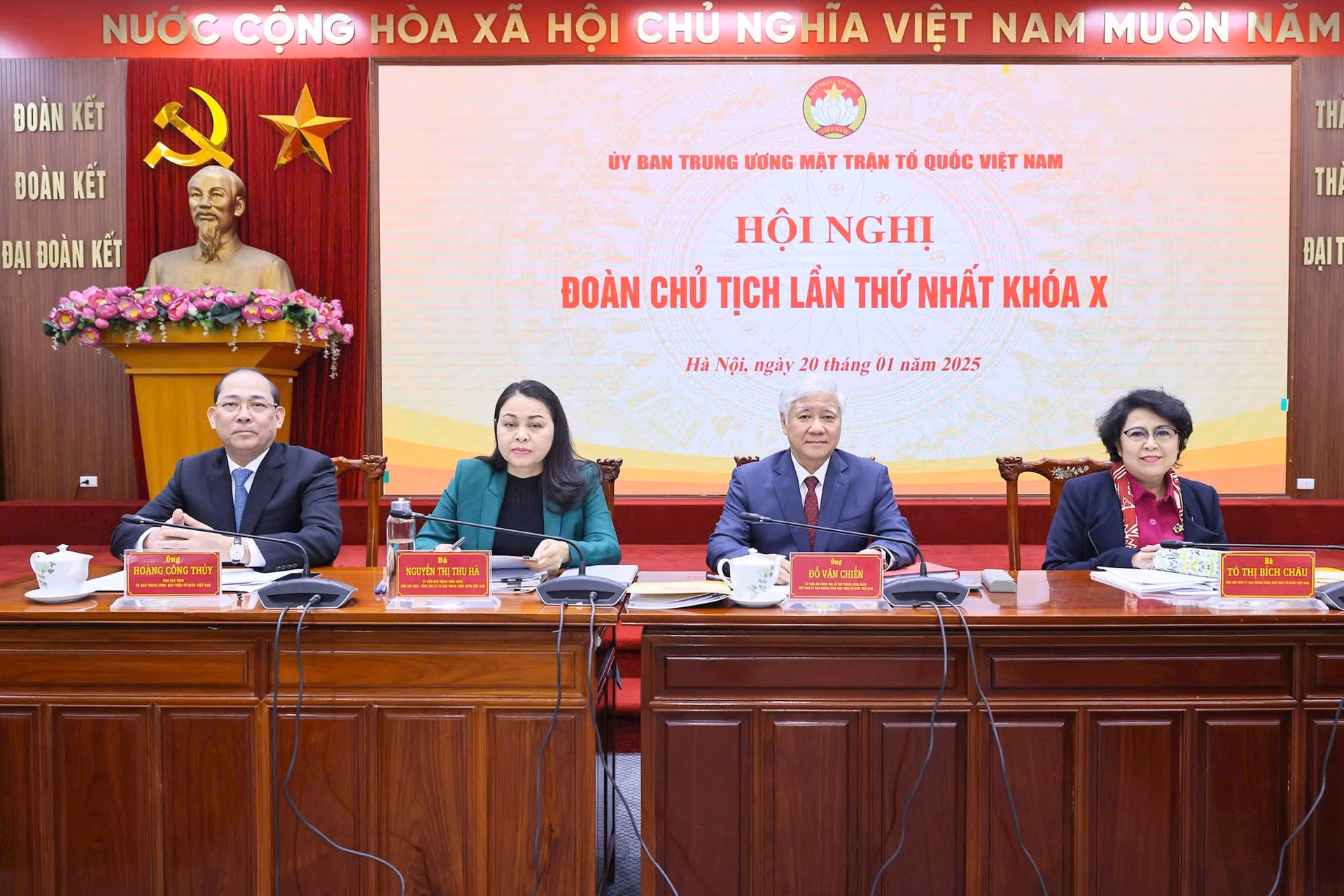 Ông Đỗ Văn Chiến, Ủy viên Bộ Chính trị, Bí thư Trung ương Đảng, Bí thư Đảng đoàn, Chủ tịch UBTƯ MTTQ Việt Nam; bà Nguyễn Thị Thu Hà, Ủy viên Trung ương Đảng, Phó Bí thư Đảng đoàn, Phó Chủ tịch - Tổng Thư ký UBTƯ MTTQ Việt Nam; các Phó Chủ tịch UBTƯ MTTQ Việt Nam: Hoàng Công Thủy, Tô Thị Bích Châu chủ trì Hội nghị.