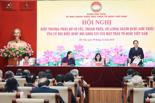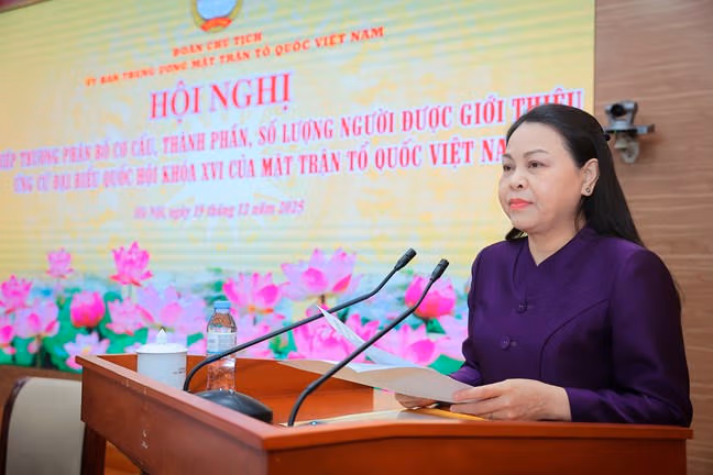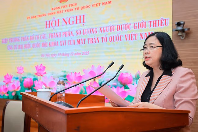 Phát biểu khai mạc Hội nghị, thay mặt Ban Thường trực Ủy ban Trung ương MTTQ Việt Nam, Chủ tịch Ủy ban Trung ương MTTQ Việt Nam Bùi Thị Minh Hoài trân trọng cảm ơn các các cụ, các vị Đoàn Chủ tịch Ủy ban Trung ương MTTQ Việt Nam, lãnh đạo các tổ chức thành viên của Mặt trận đã tới dự Hội nghị; đồng thời nhấn mạnh, Hội nghị diễn ra sau khi được Ủy ban Thường vụ Quốc hội ban hành Nghị quyết số 1939/NQ- UBTVQH15, ngày 15/12/2025 (Nghị quyết) về điều chỉnh lần thứ nhất cơ cấu, thành phần, số lượng người của cơ quan, tổ chức, đơn vị ở Trung ương và địa phương được giới thiệu ứng cử Đại biểu Quốc hội khóa XVI.