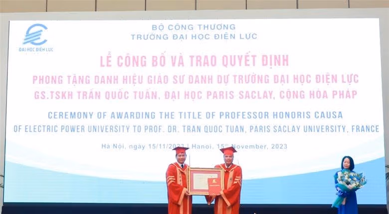 Cũng tại Lễ bế mạc, PGS.TS Đinh Văn Châu đã đại diện Trường Đại học Điện lực trao quyết định phong tặng danh hiệu Giáo sư danh dự Trường Đại học Điện lực cho GS.TSKH Trần Quốc Tuấn.