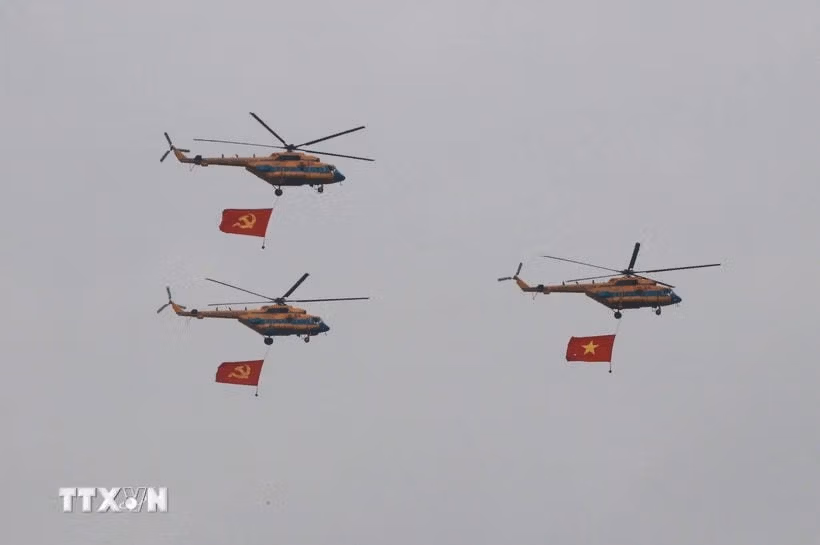 Tại buổi hợp luyện, lực lượng không quân Việt Nam thực hiện bay chào mừng với sự tham gia của 10 trực thăng; 7 tiêm kích “hổ mang chúa” SU- 30MK2 cùng biên đội máy bay huấn luyện đa nhiệm Yak-130.