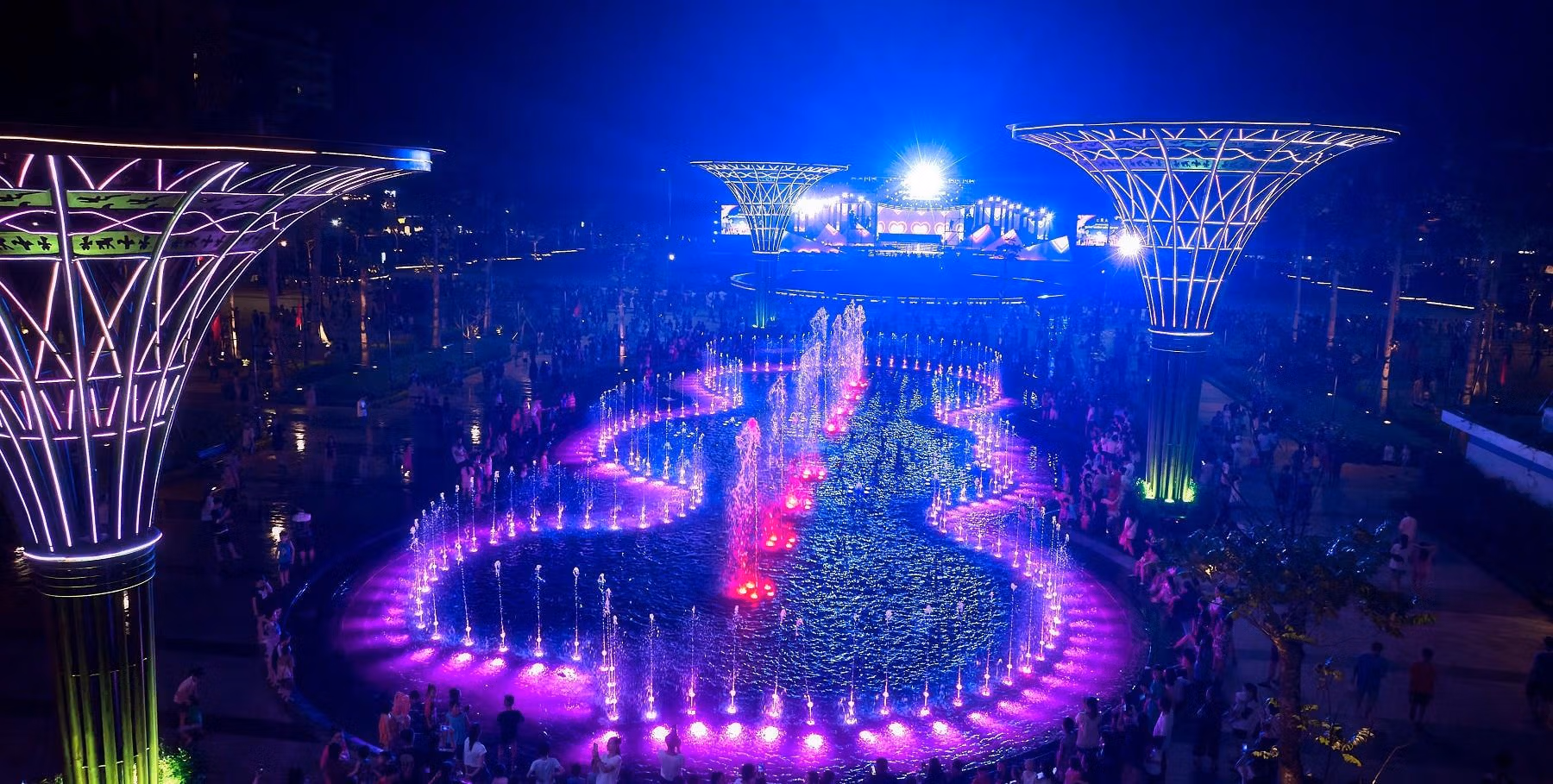 Một trong những điểm nhấn lớn nhất tại Quảng trường được nhiều du khách hào hứng, ấn tượng là hai đài phun nước được lắp đặt hệ thống chiếu sáng kết hợp âm thanh với các phần mềm hiện đại để tạo nên show nhạc nước mãn nhãn. Xuyên suốt mùa hè, từ 27/4 đến 5/9, Quảng trường sẽ mang show nhạc nước đến cho người dân và du khách thưởng thức vào mỗi tối từ thứ 2 đến thứ 7 (trừ Chủ nhật) trong khung giờ 20h45 - 21h. Với kiến trúc tôn vinh văn hóa bản địa cùng sự kết hợp của những công nghệ cao, Quảng trường được kỳ vọng sẽ là biểu tượng mới của du lịch thành phố và là điểm hẹn của những sự kiện, lễ hội tầm cỡ.