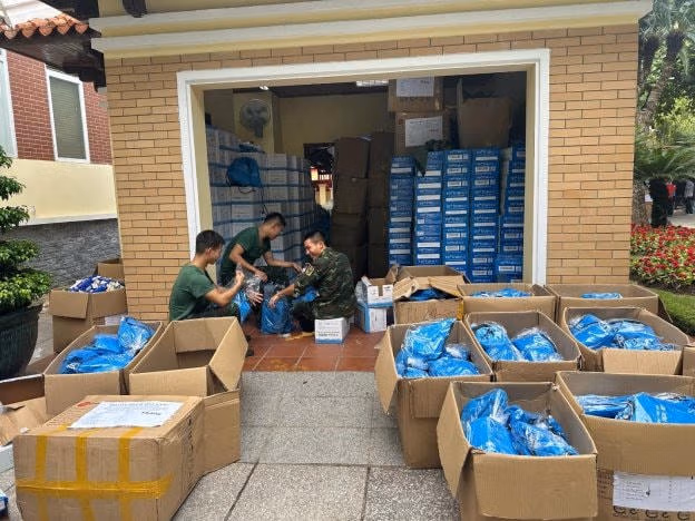 Bên trong túi quà đã có đủ áo mưa, mũ, quạt, huy hiệu A80, đồ ăn nhẹ, sữa TH true MILK và nước TH true WATER.