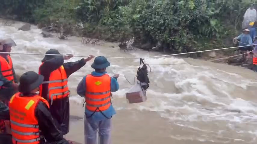 Huế: Dùng dây thừng vận chuyển lương thực cho người dân bị lũ cô lập
