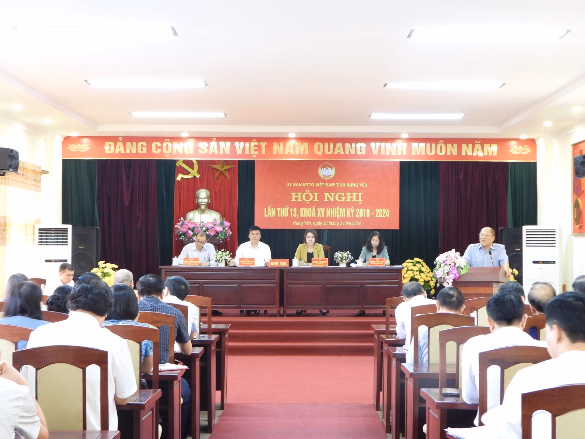 Hội nghị đã tập trung thảo luận, cho ý kiến đối với các nội dung chuẩn bị Đại hội đại biểu MTTQ tỉnh khóa XVI, nhiệm kỳ 2024 - 2029, gồm: Báo cáo tình hình và công tác chuẩn bị Đại hội đại biểu MTTQ các cấp tỉnh Hưng Yên nhiệm kỳ 2024 - 2029; Báo cáo đề án nhân sự Ủy ban MTTQ tỉnh Hưng Yên khóa XVI, nhiệm kỳ 2024 - 2029; Tờ trình dự thảo Báo cáo chính trị Đại hội MTTQ tỉnh Hưng Yên; Dự thảo Nghị quyết hội nghị lần thứ 13...