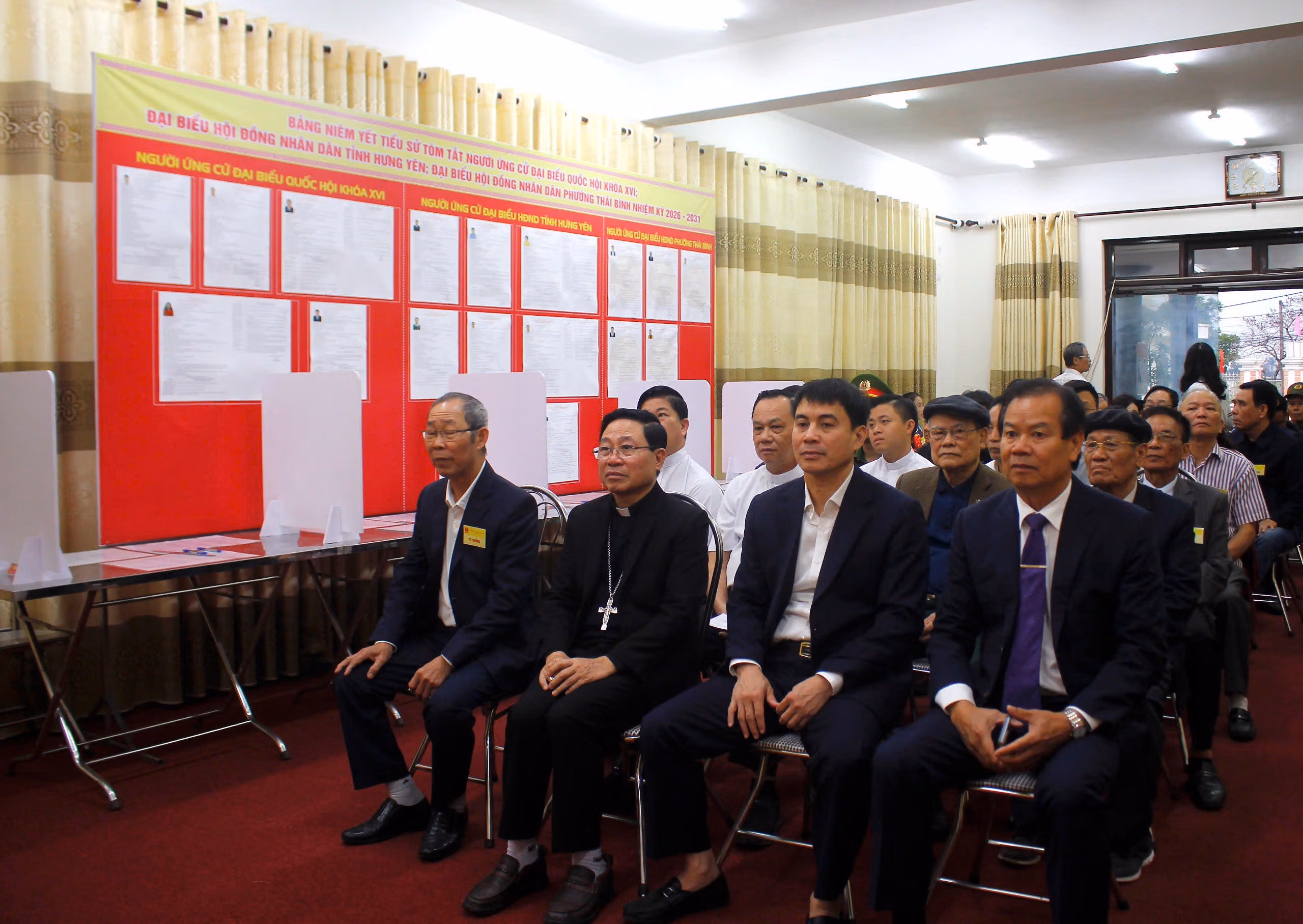 Tại kỳ bầu cử này, các chức sắc, chức việc, các nữ tu thuộc Tòa Giám mục Thái Bình tham gia bỏ phiếu tại Tổ bầu cử số 4, phường Thái Bình, tỉnh Hưng Yên, gần Tòa Giám mục.