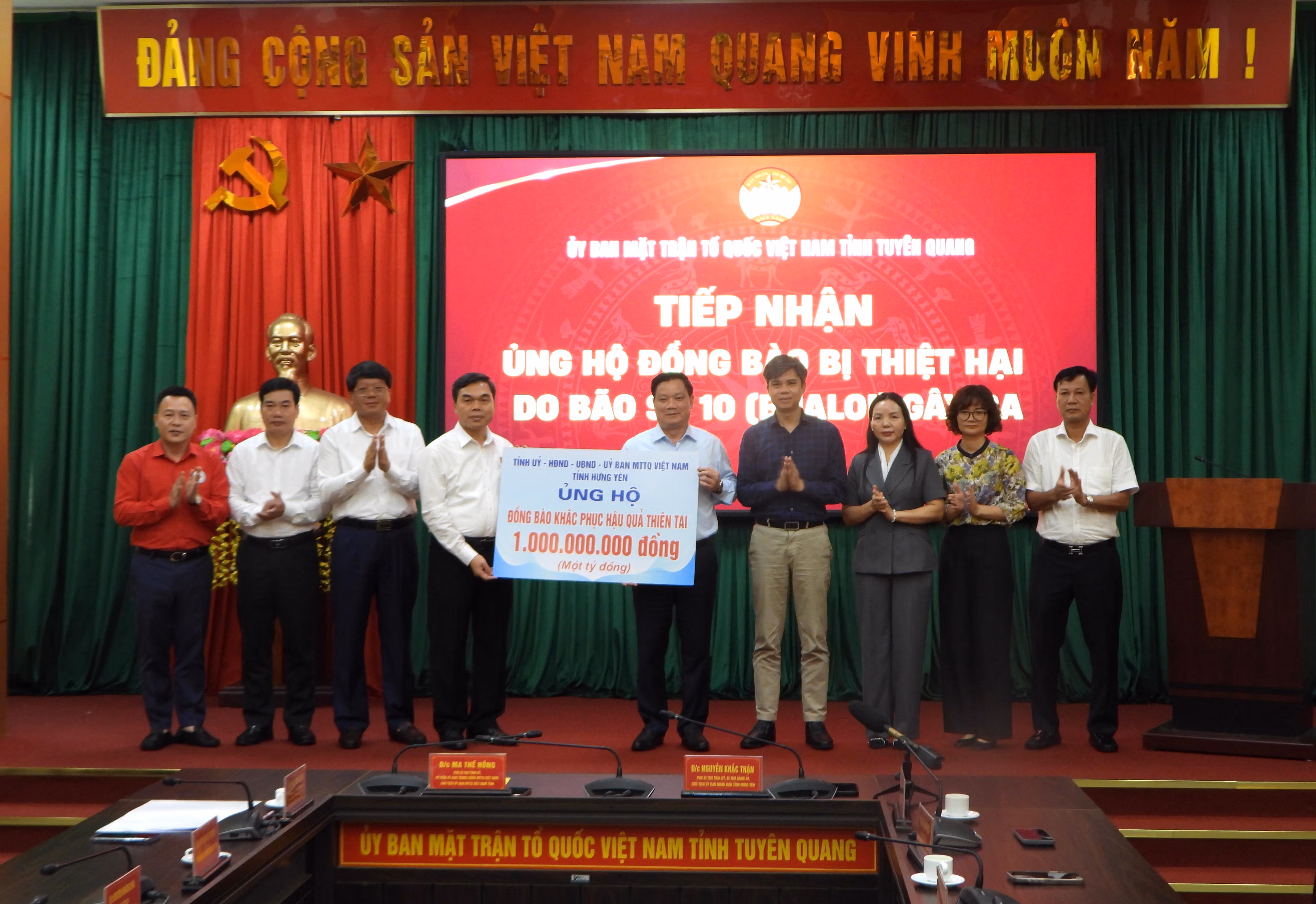 Thay mặt Tỉnh ủy, HĐND, UBND, Ủy ban MTTQ Việt Nam tỉnh Hưng Yên, Chủ tịch UBND tỉnh Hưng Yên Nguyễn Khắc Thận đã trao biểu trưng hỗ trợ 1 tỷ đồng cho tỉnh Tuyên Quang khắc phục hậu quả mưa bão gây ra.