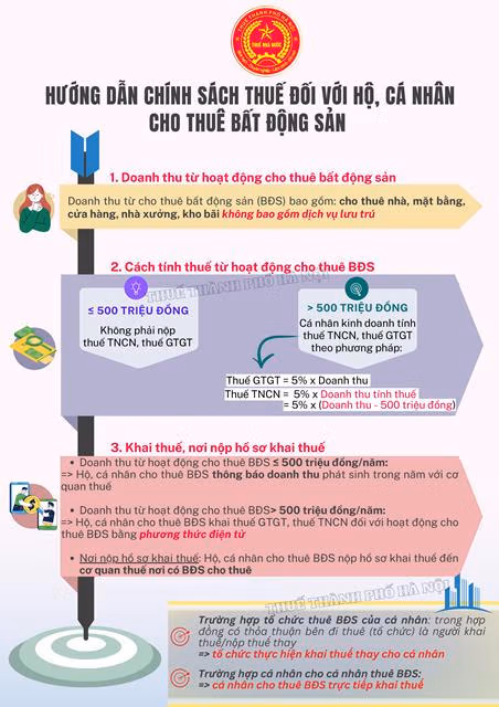 Hướng dẫn chính sách thuế đối với hộ cá nhân cho thuê bất động sản Thứ Năm 29/01/2026 20:33 (GMT+7) Thuế Hà Nội vừa có hướng dẫn cụ thể chính sách thuế GTGT, TNCN với hộ, cá nhân cho thuê bất động sản. Thuý Hằng