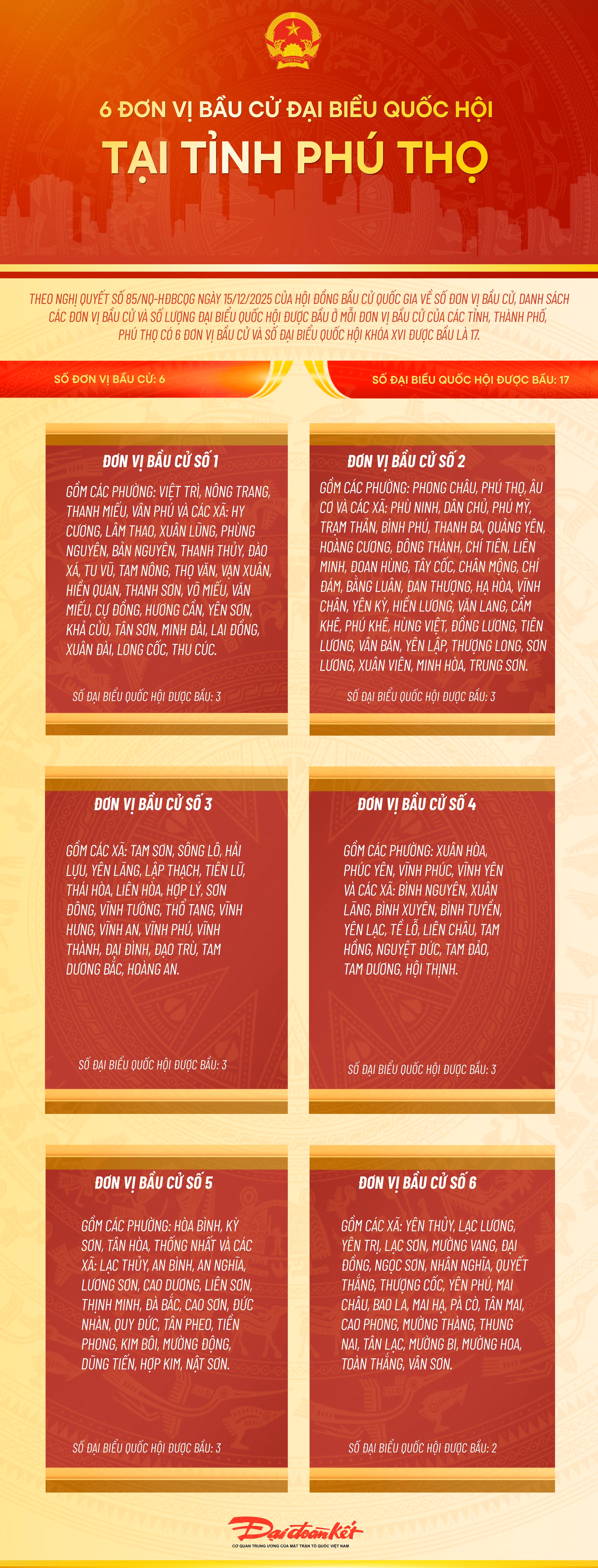 Theo Nghị quyết số 85/NQ-HĐBCQG ngày 15/12/2025 của Hội đồng Bầu cử quốc gia về số đơn vị bầu cử, danh sách các đơn vị bầu cử và số lượng đại biểu Quốc hội được bầu ở mỗi đơn vị bầu cử của các tỉnh, thành phố, Phú Thọ có 6 đơn vị bầu cử và số đại biểu Quốc hội khóa XVI được bầu là 17.