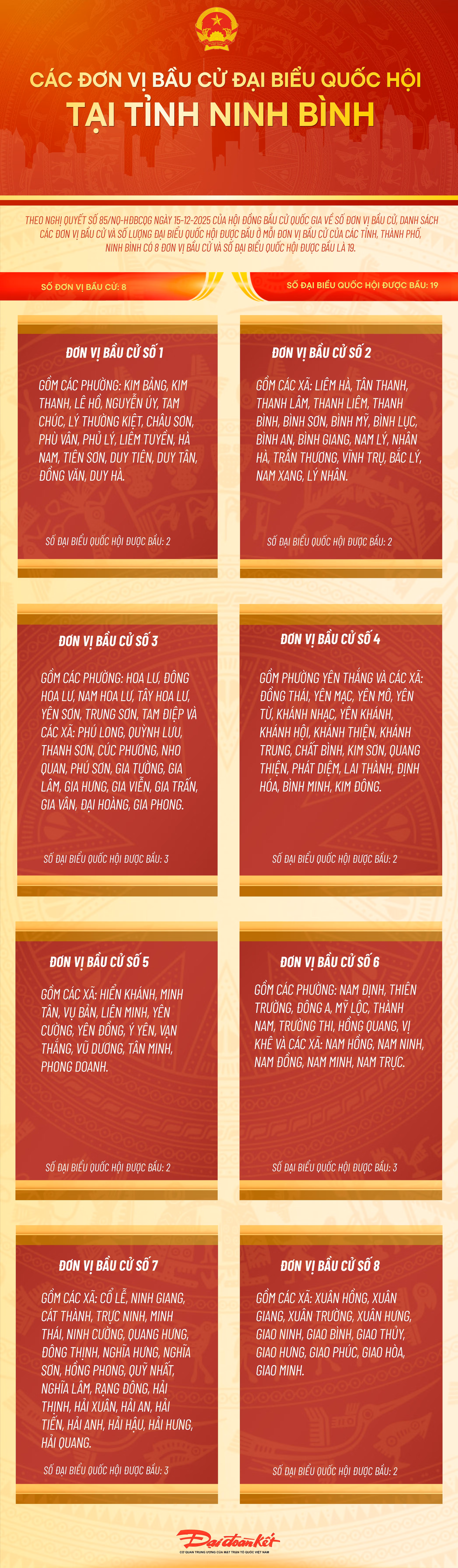 Theo Nghị quyết số 85/NQ-HĐBCQG ngày 15/12/2025 của Hội đồng Bầu cử quốc gia về số đơn vị bầu cử, danh sách các đơn vị bầu cử và số lượng đại biểu Quốc hội được bầu ở mỗi đơn vị bầu cử của các tỉnh, thành phố, Ninh Bình có 8 đơn vị bầu cử và số đại biểu Quốc hội khóa XVI được bầu là 19.