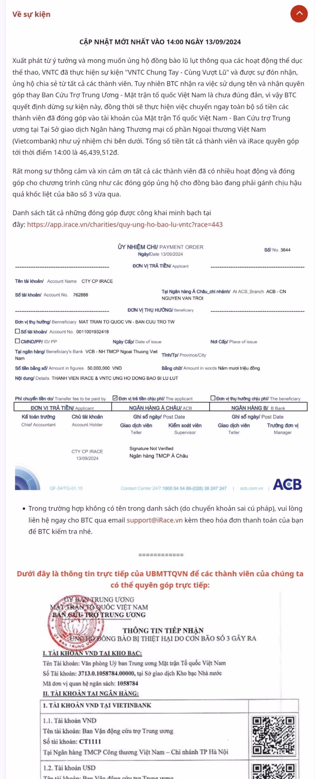 Tuy nhiên, sau khi đọc bài đăng trên page của UBTƯ MTTQ Việt Nam, nhận thấy việc sử dụng tên của UBTƯ MTTQ Việt Nam trong nội dung kêu gọi quyên góp là chưa đúng đắn nên iRace và VNTC quyết định dừng sự kiện lại và thông báo cho toàn bộ thành viên tham gia.