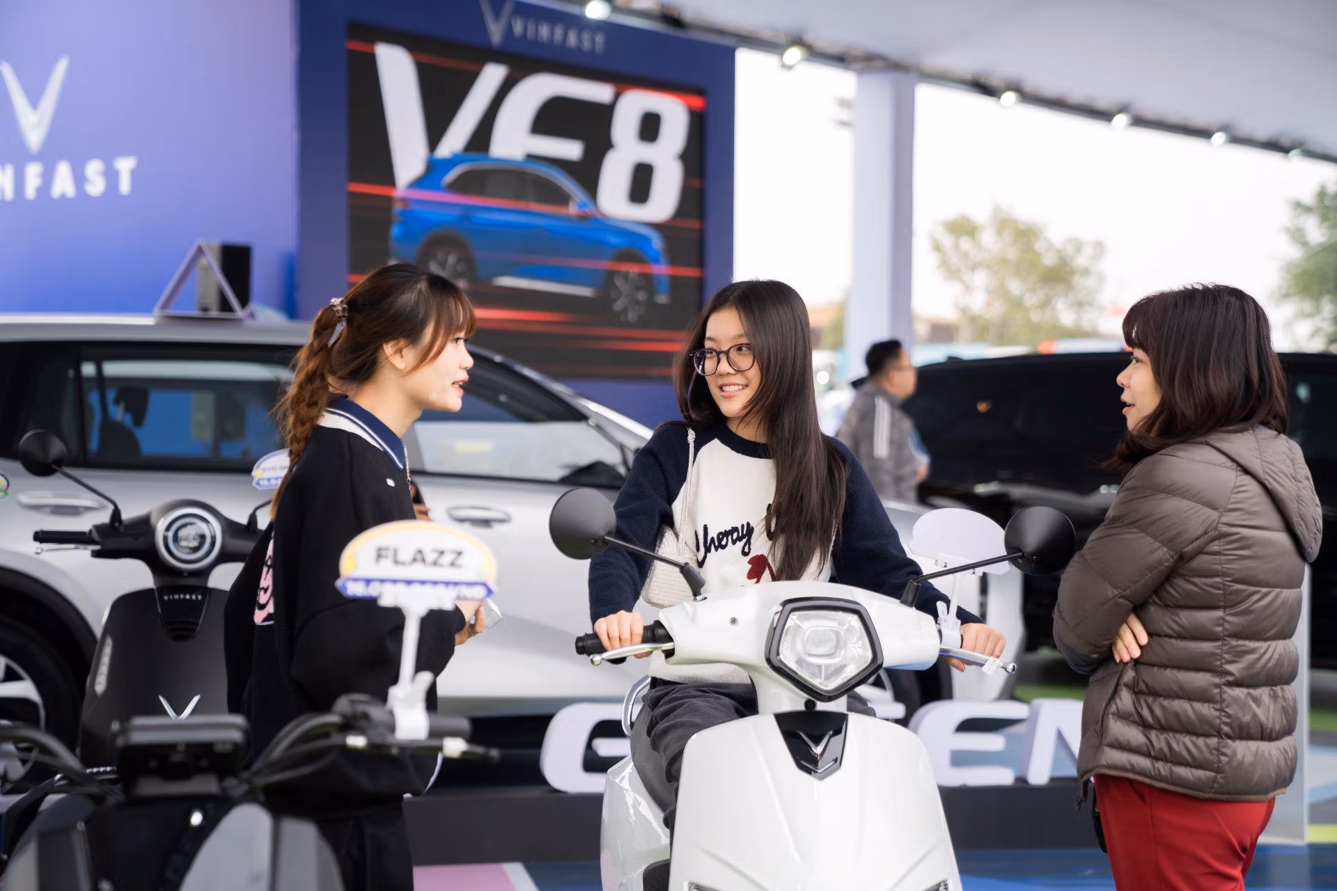 Bên cạnh các mẫu ô tô điện, khách tham quan còn thích thú với các mẫu xe máy điện VinFast, từ Evo Grand, Feliz, Vero X tới các mẫu xe mới Flazz, ZGoo. Các mẫu xe máy điện có thiết kế hiện đại, gọn gàng, hướng đến nhiều nhóm khách hàng khác nhau, từ học sinh, sinh viên đến người đi làm hay tài xế công nghệ.
