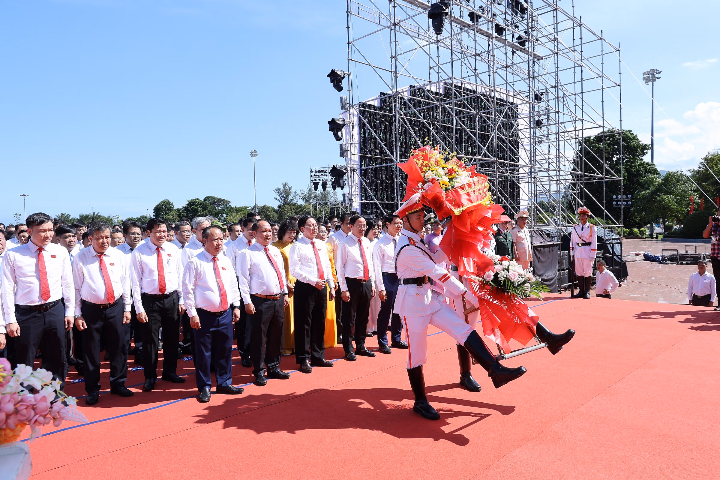 Cũng chiều nay, Tỉnh ủy, HĐND, UBND, Ủy ban Mặt trận Tổ quốc Việt Nam tỉnh Gia Lai đã tổ chức lễ dâng hoa tại Tượng đài Nguyễn Sinh Sắc-Nguyễn Tất Thành, tại Quảng trường Nguyễn Tất Thành, phường Quy Nhơn, tỉnh Gia Lai.