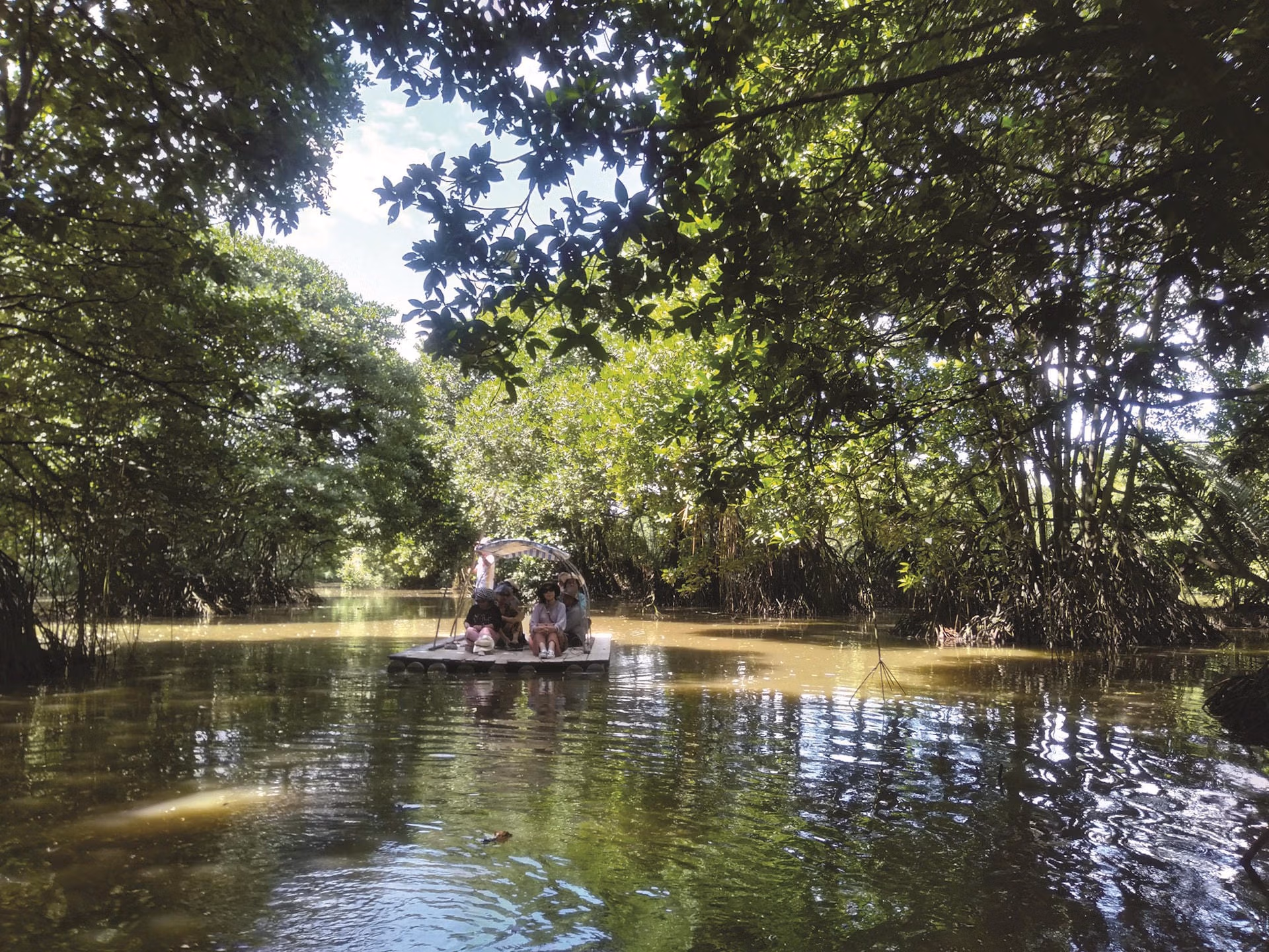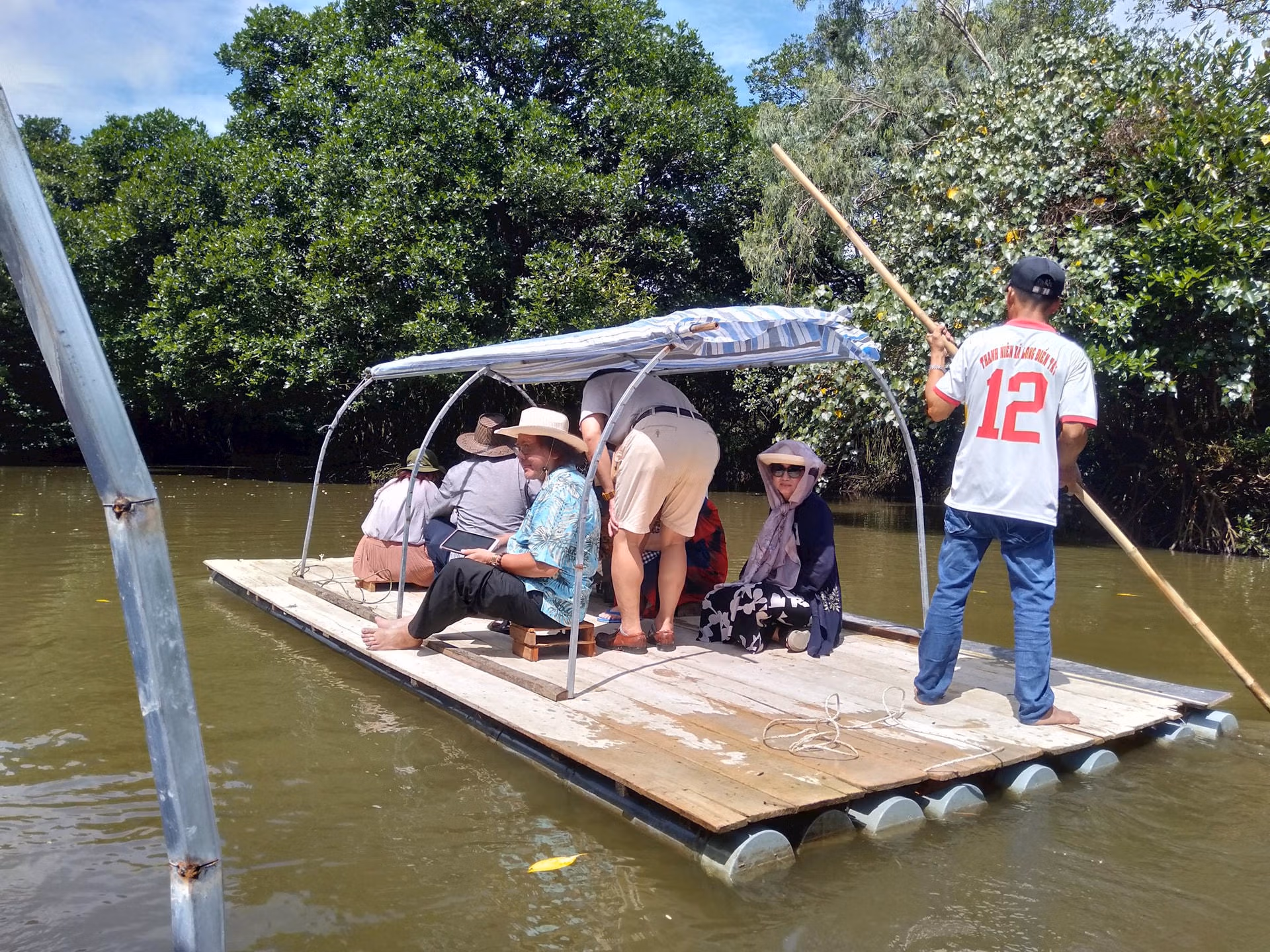 Để chứng minh cho du lịch miệt vườn của gia đình mình, ông Sáu Sĩ mời cả đoàn chúng tôi xuống bè để “đi dạo” trong vườn. Nghe nói ngồi bè đi dạo trong vườn thì ai nấy đều háo hức. Hai chiếc bè được ghép bằng những thân cây tràm nhẹ nhàng rời bến. Mỗi bè có một thanh niên trong ấp chống chèo. Chiếc bè chậm rãi đưa chúng tôi vào sâu trong rừng. Hiện là ban ngày nên chim đã bay đi kiếm ăn nên thi thoảng chúng tôi mới thấy những con chim ngủ quên đậu trên vòm cây. Ông Lâm bảo: “Nếu các anh các chị chịu ở lại thì sẽ thấy chim bay về. Chim bay về náo nhiệt cả khu ruộng rừng này. Tiếng chim ồn ã lắm nhưng rất vui các anh chị ạ”.