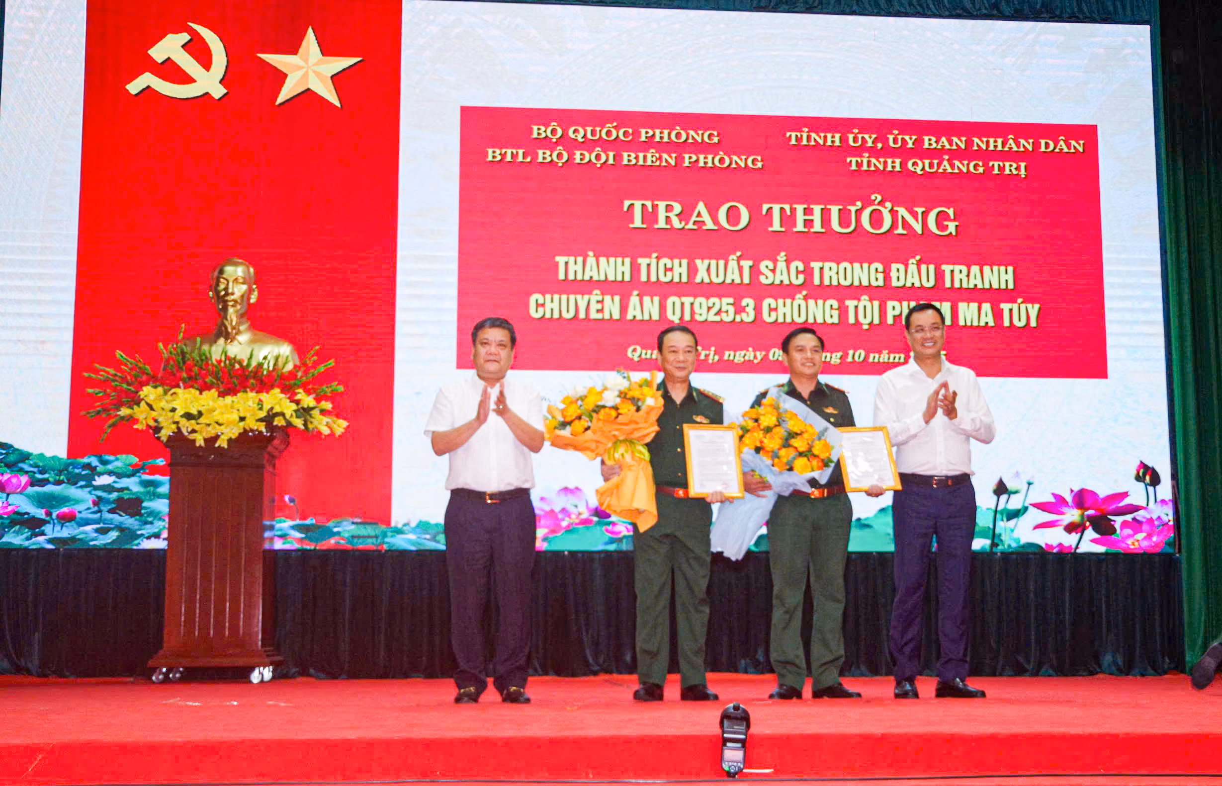Sáng 9/10, tại Bộ Chỉ huy Bộ đội Biên phòng (BĐBP) tỉnh Quảng Trị, Bộ Tư lệnh BĐBP phối hợp với Tỉnh ủy, UBND tỉnh Quảng Trị tổ chức trao thưởng cho các tập thể, cá nhân có thành tích xuất sắc trong đấu tranh, triệt phá chuyên án QT925.3 vụ án có số lượng ma túy bị thu giữ lớn nhất từ trước đến nay trên địa bàn tỉnh.