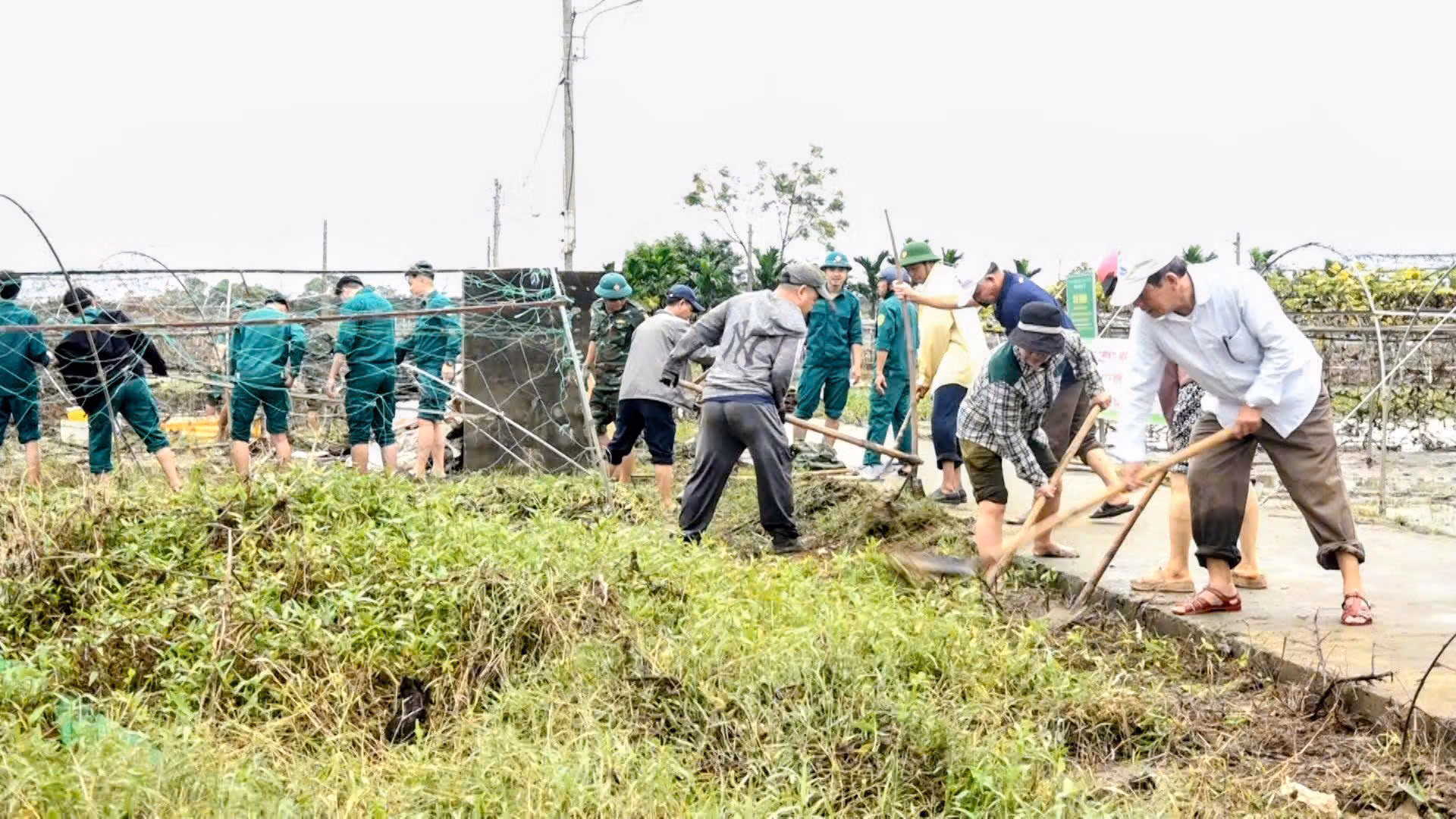 Lực lượng vũ trang, nông dân, thanh niên phường Cẩm Lệ ra quan dọn vệ sinh, khôi phục sản xuất tại vùng rau La Hường, TP Đà Nẵng.