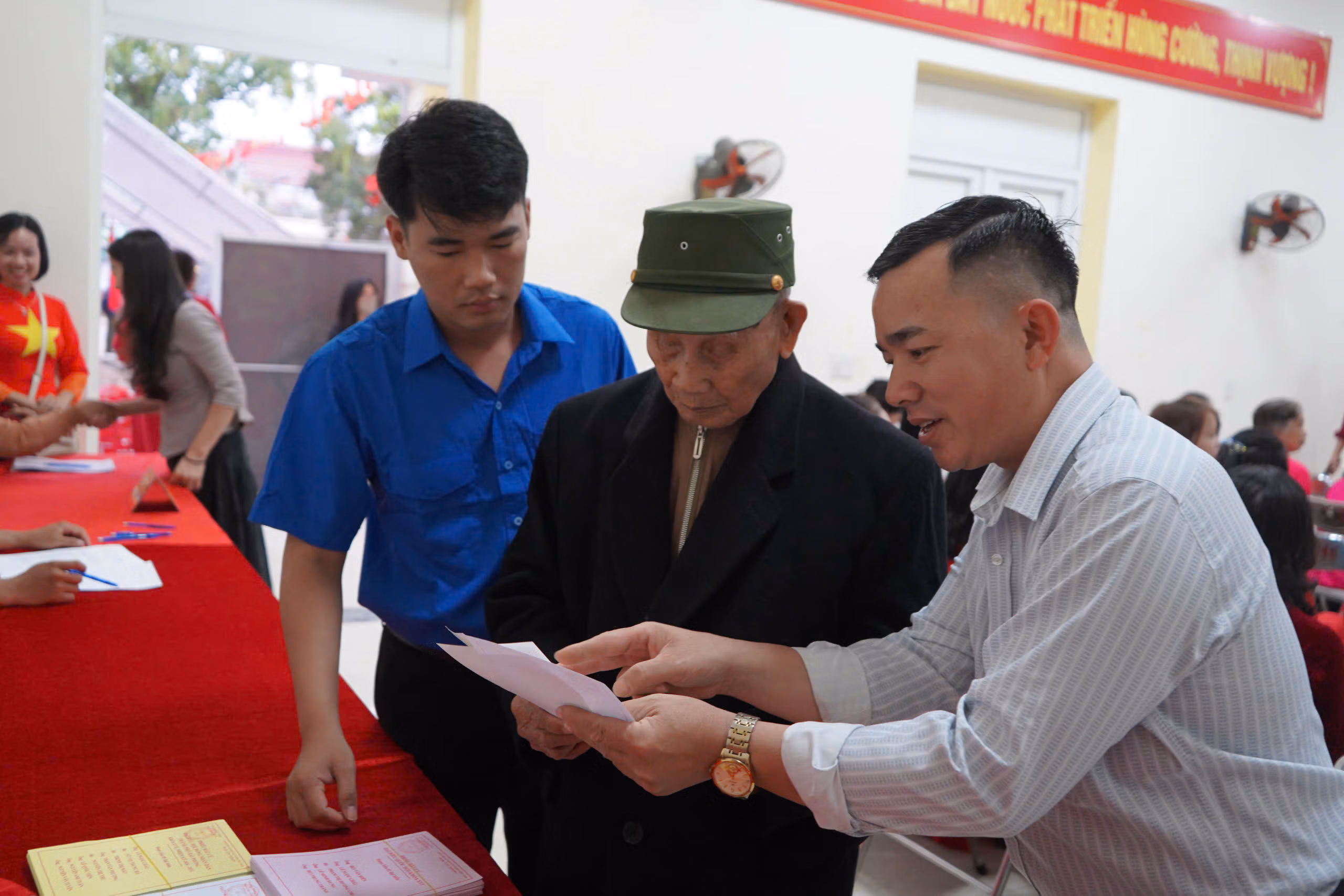 Cụ Ngô Văn Sinh, 103 tuổi, cử tri phường Dương Kinh đi bỏ phiếu. Ảnh: PT.