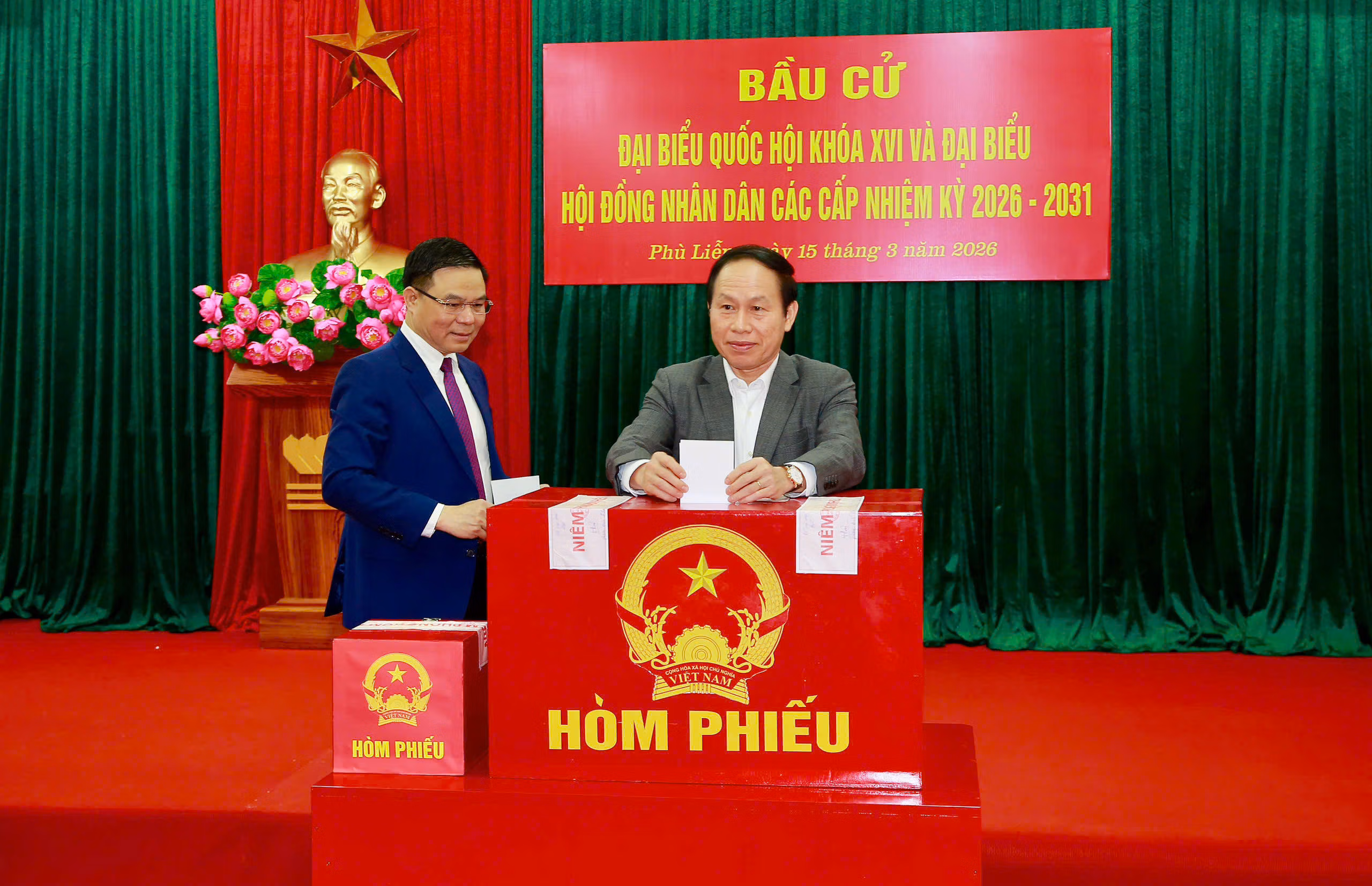 Ông Lê Tiến Châu, Ủy viên Trung ương Đảng, Bí thư Thành ủy Hải Phòng; ông Lê Mạnh Hùng, Uỷ viên Trung ương Đảng, Quyền Bộ trưởng Bộ Công thương bỏ phiếu tại phường Phù Liễn. Ảnh: TH.