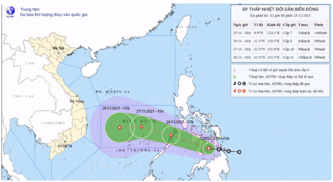 Vào lúc 1 giờ ngày 26/11, theo hướng Tây Tây Bắc, tốc độ khoảng 20-25 km/h, có khả năng đi vào Biển Đông, vị trí 11,5N-119,5E; trên vùng biển phía Đông Nam khu vực Giữa Biển Đông; Có khả năng mạnh lên thành bão. Cấp 8, giật cấp 10. Vùng nguy hiểm: Vĩ tuyến 9,50N-13,50N; phía Đông kinh tuyến 118,00E; Cấp độ rủi ro thiên tai (Khu vực chịu ảnh hưởng): Cấp 3: vùng biển phía Đông khu vực Giữa Biển Đông và vùng biển phía Đông Bắc khu vực Nam Biển Đông