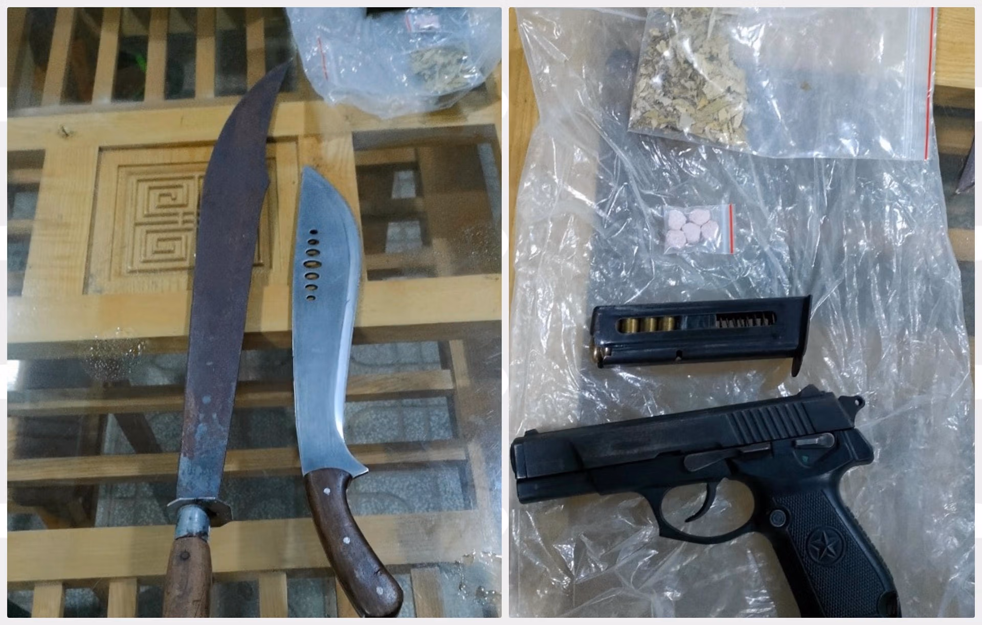 Qua khám xét, trên người đối tượng có cất giấu 4 túi nylon màu trắng. Bên trong các túi có chứa 50 viên nén màu hồng và nhiều hạt tinh thể rắng màu trắng (nghi là chất ma túy). Tổ công tác tiếp tục khám xét chỗ ở của đối tượng thì thu giữ được 1 súng ngắn, cùng 9 viên đạn (nghi là vũ khí quân dụng), 5 viên nén màu hồng (nghi là ma túy), cùng 2 dao tự chế.